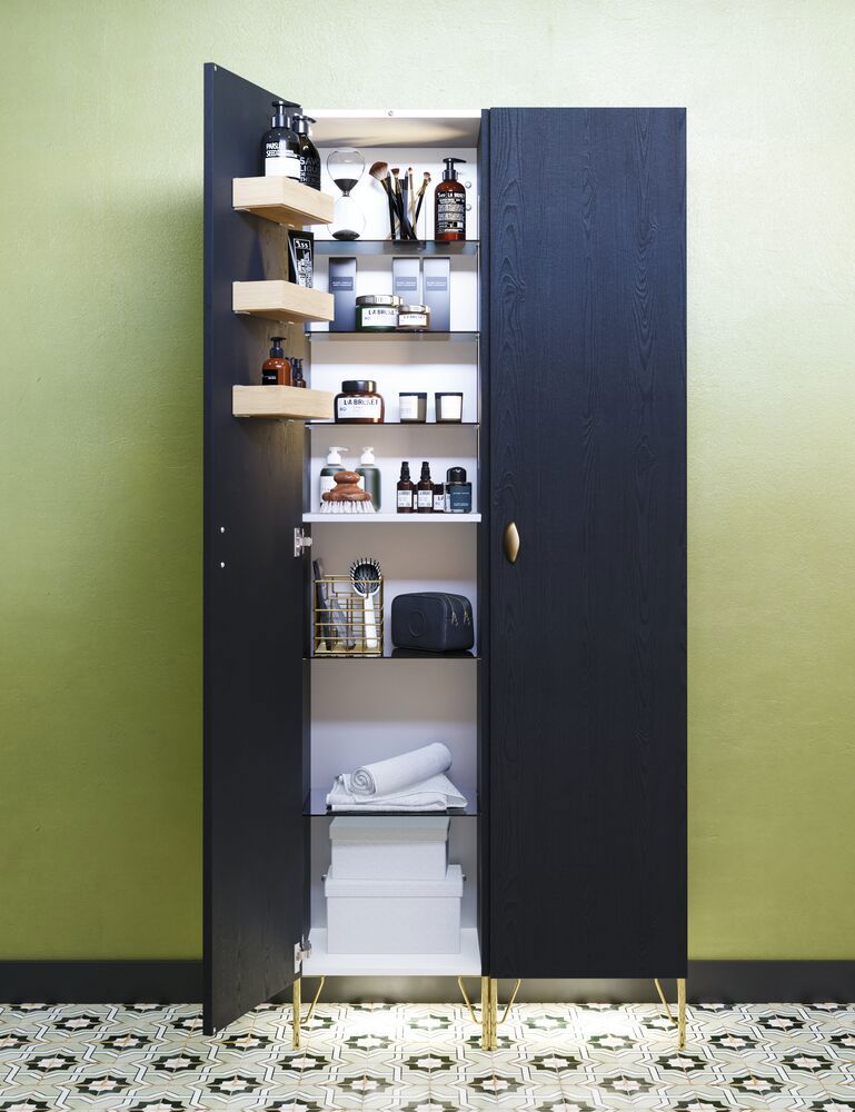 Utvalda skåp finns även med extra trälådor för dörren, vilket ger dig ännu mer utrymme i ditt högskåp. Dessa trälådor kan tas bort från dörren och tas med runt i badrummet för att förvara nagelklippare, smink, bomullsrondeller och sminkborttagningsmedel. De kan enkelt tas från högskåpet till handfatet för användning och sedan tillbaka till högskåpet igen efter användning.