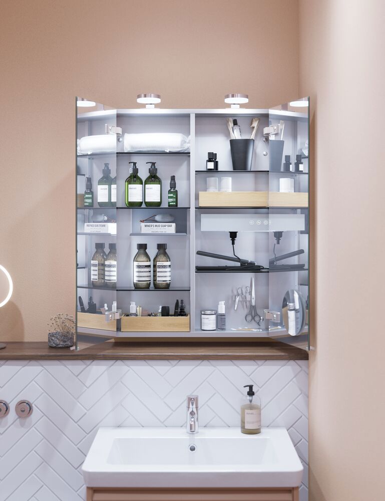 Förvaring är en av de viktigaste faktorerna i ett badrum, och ett spegelskåp ger dig en smart och diskret lösning där dina viktigaste produkter finns nära till hands. Tandborstar, krämer och mediciner kan enkelt organiseras på hyllorna i skåpet för att undvika att det blir rörigt på handfatet.