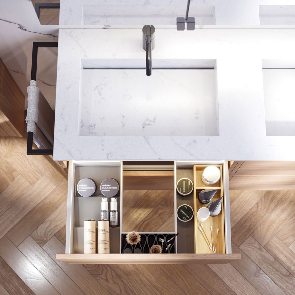 För att förbättra både funktionalitet och atmosfär i badrummet kan du lägga till belysning under tvättställsskåpet eller i lådorna för bättre överblick och en trevlig stämning.