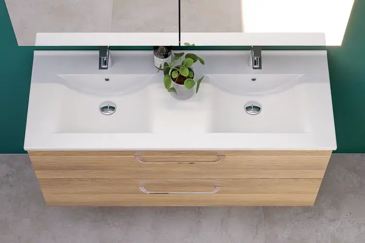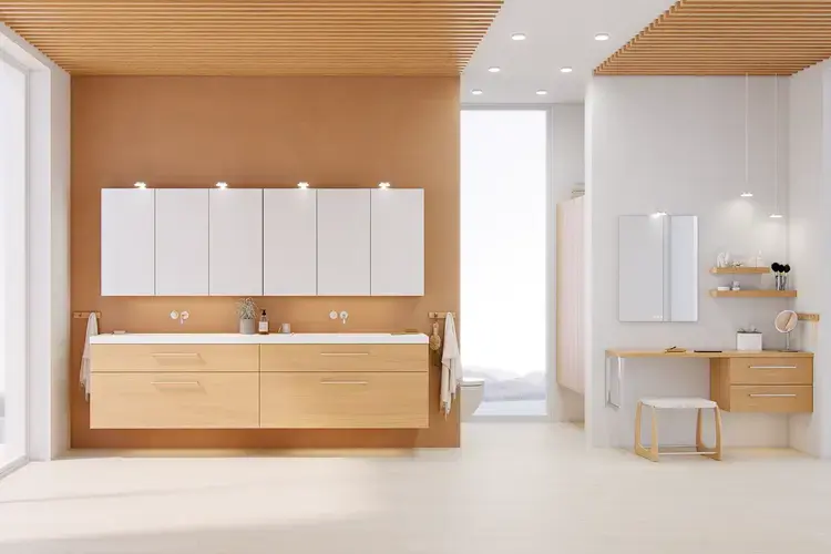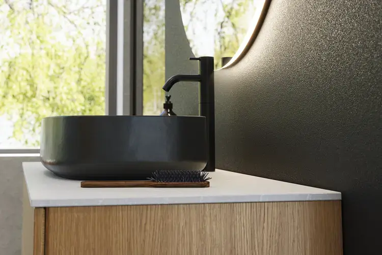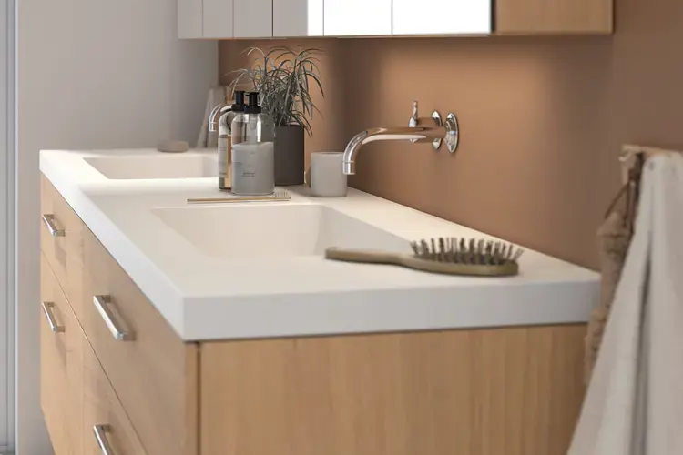 Om du föredrar "levande" material, kan du integrera naturen i ditt badrum med olika träytor. Välj ljusa, nordiska träfärger som natur ek och vit ek om du vill införa en ljus, skandinavisk stil i ditt badrum. Gyllene och rödbruna träfärger som rödbrun ek, brun ek och grå ask skapa en behaglig och varm atmosfär i rummet. De mörkare träfärgerna som ek noir och svart ek ger intrycket av klassisk elegans och säker stil.