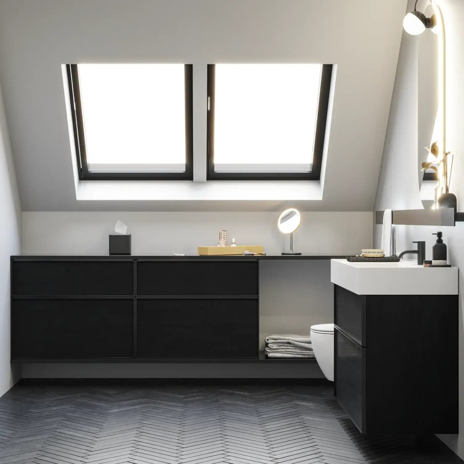 Skapa ro i ett mindre rum med en vägg-till-vägg-lösning. Var kreativ med sneda väggar och tänk t.ex. in en öppen hylla som här. En stor spegel gör rummet större och det vackra fristående tvättstället med sina mjuka linjer gör badrummet helt unikt.