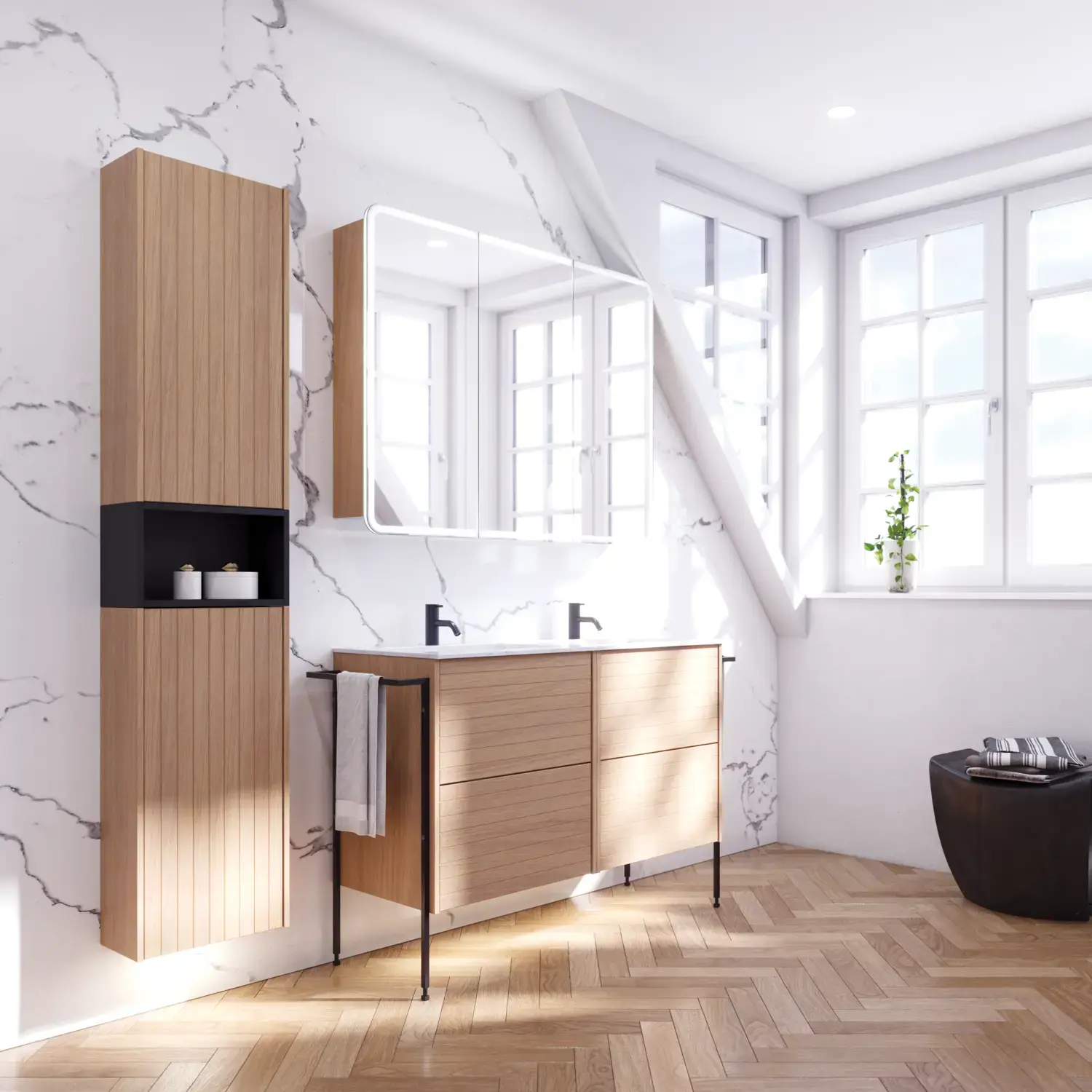 Flexibilitet är vårt ledord när vi utvecklar innovativa lösningar på badrumsinredning. Vi strävar efter att erbjuda dig många alternativ. På Dansani är vi specialister inom badrum, och våra produkter kännetecknas av högkvalitativa material med lång livslängd – och de förblir lika eleganta efter många års användning. Ett vackert och funktionellt dubbelt tvättställ tillsammans med ett elegant och praktiskt tvättställsskåp kan förnya ditt badrum på ett stilfullt sätt.