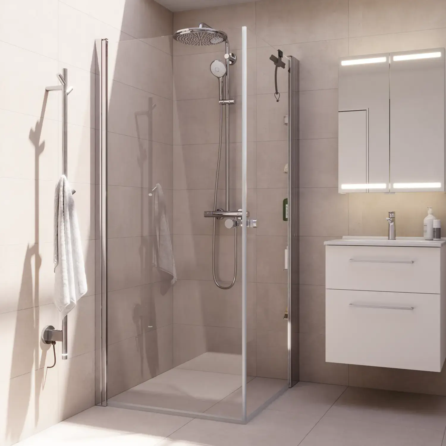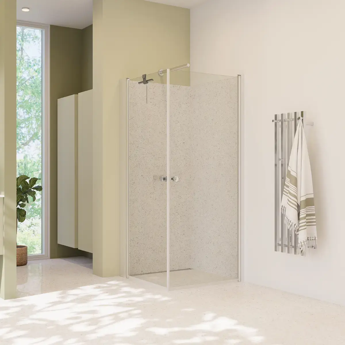 Den fasta skärmväggen ger möjlighet att möblera tätt intill. När du inte använder duschen kan slagdörrarna vikas in utan att slå emot armaturen, så att du får mer plats.