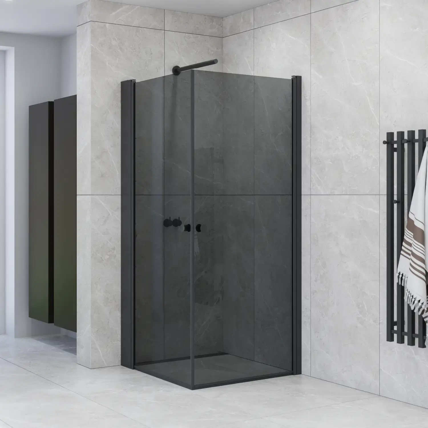 Med tonat, svart glas får du en duschavskärmning med ett exklusivt och uttrycksfullt intryck som tillför badrummet djup och karaktär. Glaset minskar insyn och ger mer privatliv, samtidigt som det fortfarande låter ljuset spela vackert i rummet.