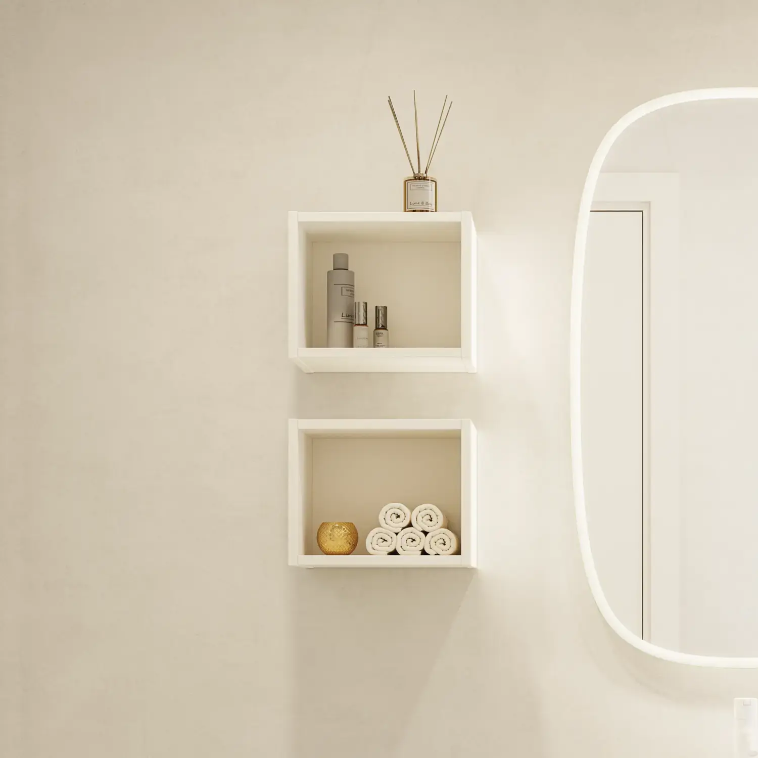 Våra överskåp är ideella för parfymer och skönhets artiklar. Det ger dig bra överblick och du kan även tillföra praktiska trälådor för småsaker. Överskåpet tar inte mycket plats i det lilla badrummet.