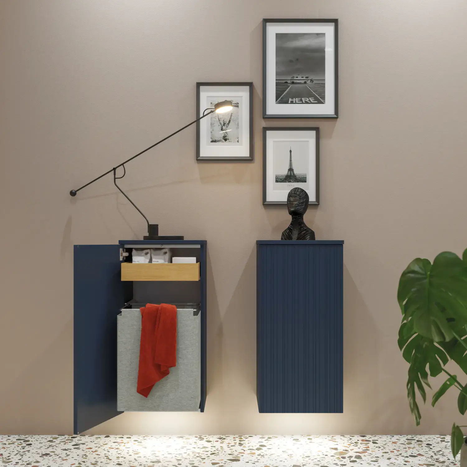 Till Luna högskåpen erbjuder vi olika inredningsversioner – en basversion A med 6 hyllor, en version B med 2 uttagbara trälådor i 30 cm bredd och för 40 cm bredd med 3 hyllor på dörren, så att du har lättare åtkomst till ditt innehåll. Slutligen finns version C, där du förutom de 3 hyllorna på dörren också får 2 utdragbara trälådor och en smart tvättkorg