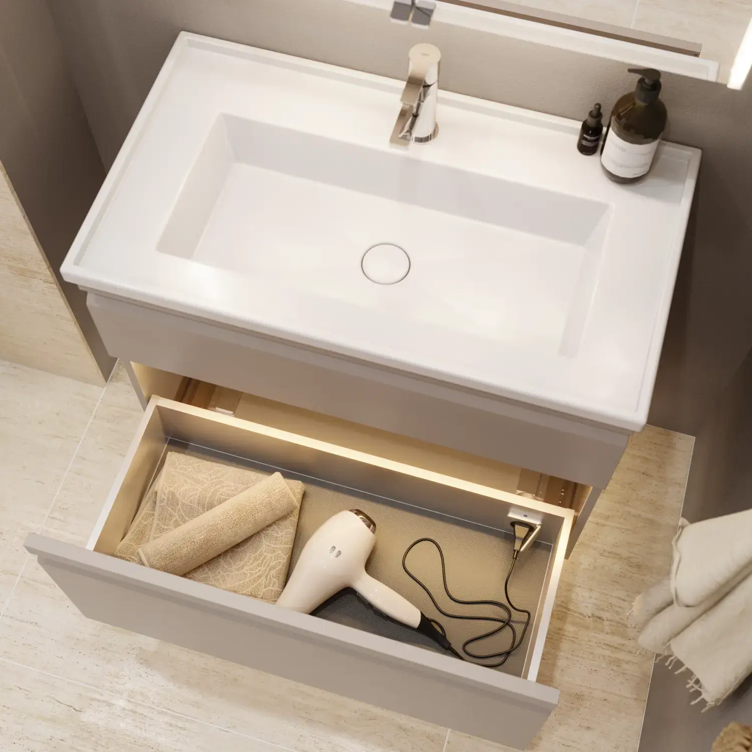 Det är lättare att låta hårtorken och plattången sitta kvar i eluttaget istället för att plocka undan och rulla ihop sladden efter användning. Du skall använda den i morgon bitti ändå. Unna dig komforten och välj till eluttag i skåp och lådor, så du kan förvara dina apparater där och undviker att sakerna ligger framme i badrummet. Det är även praktiskt när du ska ladda rakapparaten eller tandborsten. Eluttaget blir monterat i nedre lådan på tvättställsskåpen. Kan även köpas separat för placering i lådor och skåp.