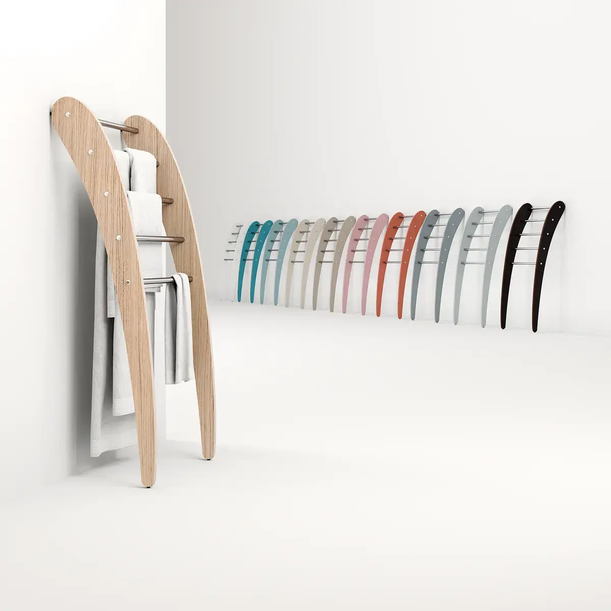 Den mobila handdukshängaren är ett dekorativt badrumstillbehör och på samma gång fyller den behovet för förvaring av blöta handdukar. Saknar du plats kan du placera den i duschen när du inte använder den. Den kan också användas i sovrummet som extra klädhängare så att använda kläder vädras innan man hänger in dem i skåpet.