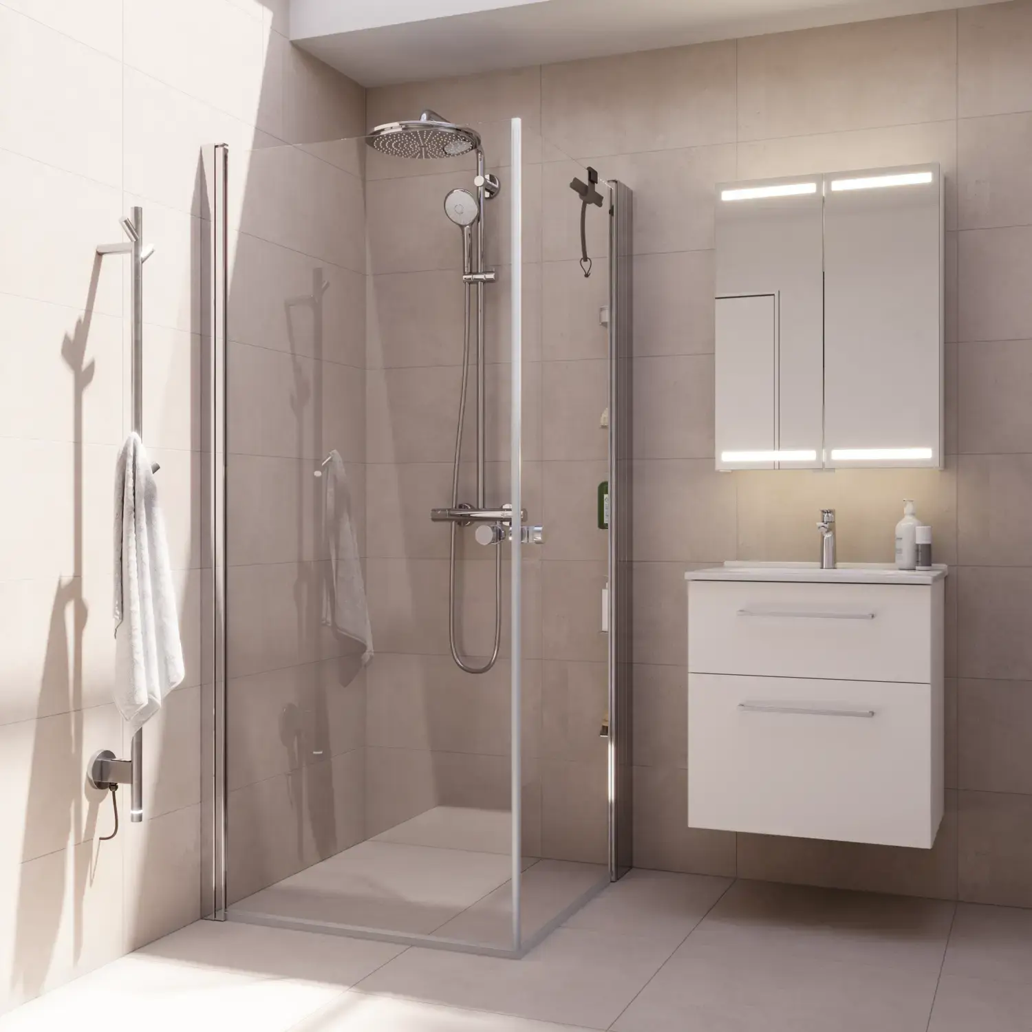 Tips: Utnyttja väggarna! Kombinera din handdukstork med vägghängda skåp eller spegelskåp med förvaring för att frigöra golvyta och skapa rymd i rummet.