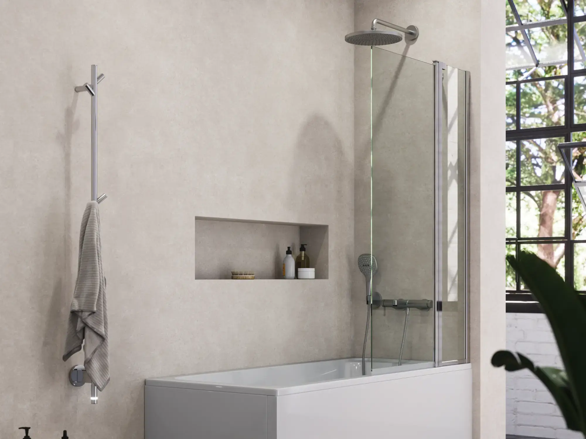 Kalkfläckar på speglar, möbler och golv är ofta resultatet när man duschar i badkaret i ett litet badrum. Med en enkel och elegant badkarsvägg som efter användning kan vikas in framför duscharmaturen undviks detta problem samtidigt som det finns tillräckligt med utrymme framför spegeln.