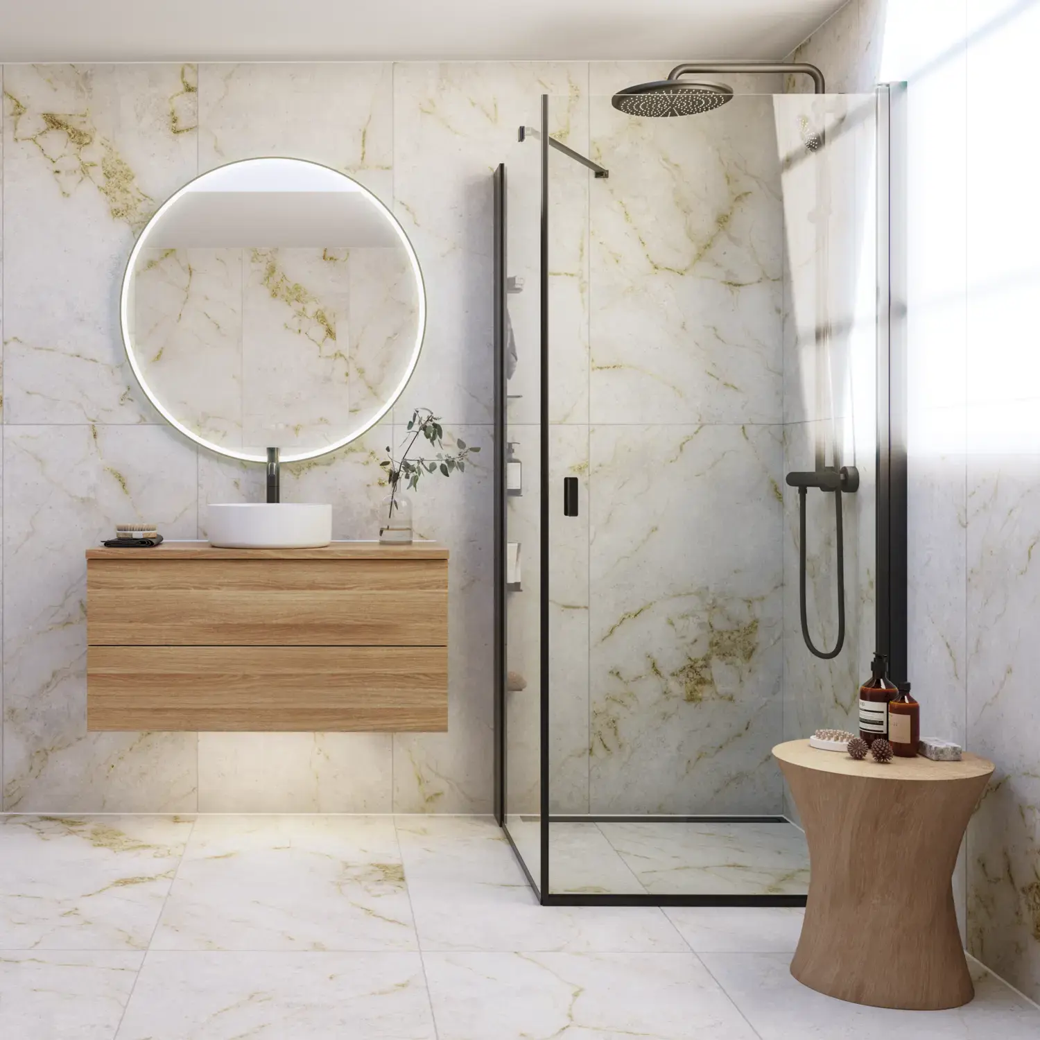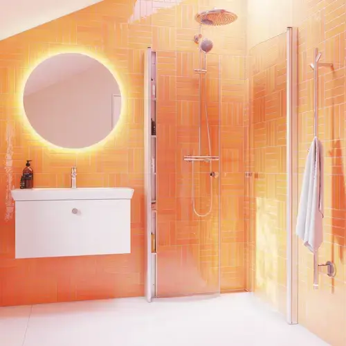 I mindre badrum är det ofta nödvändigt att placera duschyta och skåp nära varandra. För att undgå fuktskador måste skåpen skyddas mot vatten. En fast duschvägg med öppning mot duschområdet eller en nischdörr med fast sidoglas är särskilt lämpliga för detta ändamål. Med dessa modeller skyddar sidoglaset möblerna och möjliggör samtidigt en helt tät duschmodell med dörr.