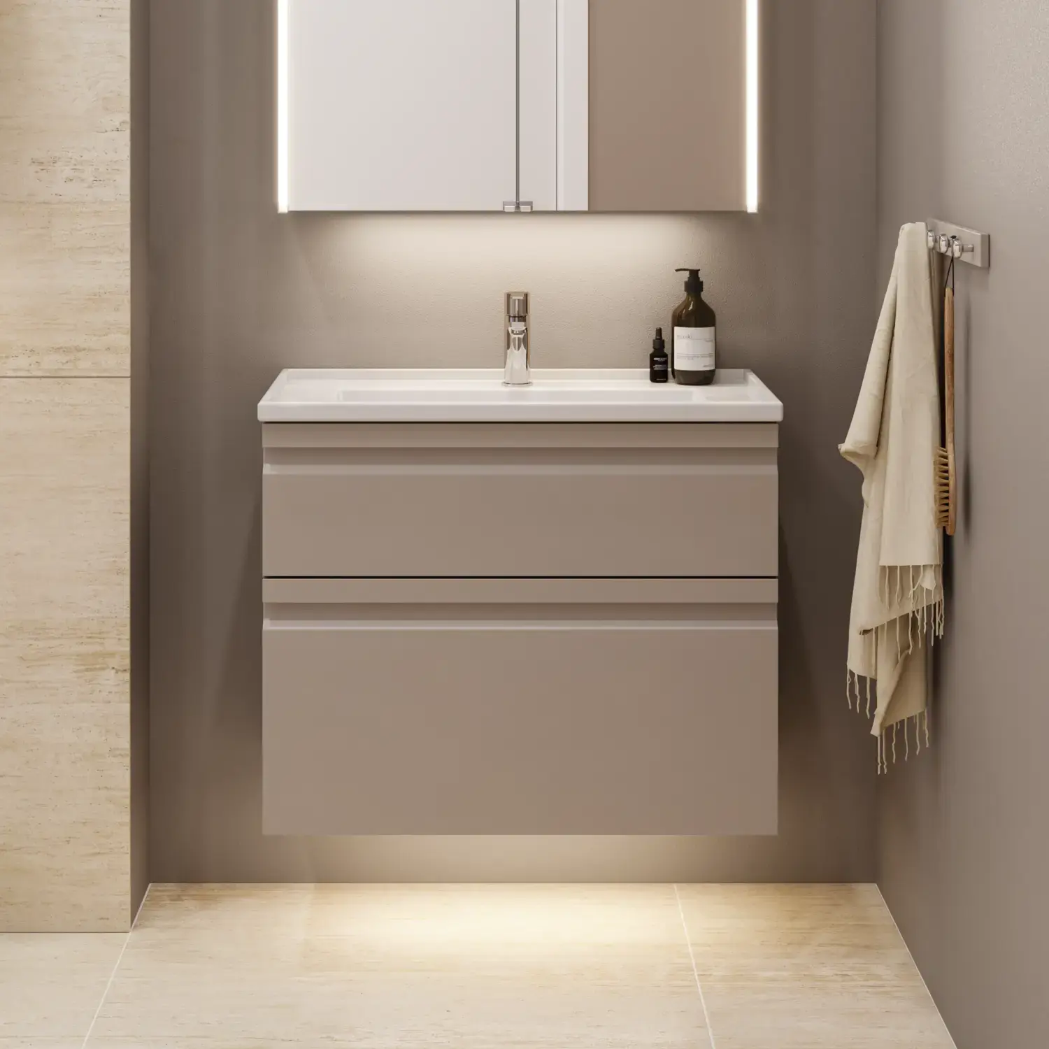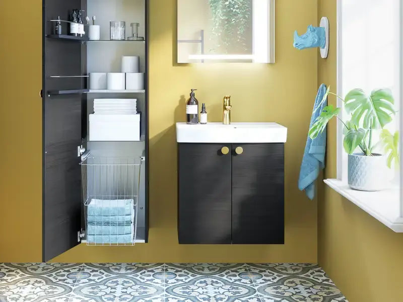 Ett extra högt tvättställsskåp med en höjd på 64 cm ger dig möjlighet att utnyttja ytan under tvättstället och skapa extra förvaring för exempelvis stora mängder handdukar eller höga flaskor som vanligtvis inte är plats för i de lägre lådorna. I det smala och avlånga badrummet kan du välja ett kompakt tvättställ och optimera väggytan med ett högskåp för extra förvaring. Om ditt badrum är smalt kan du placera två överskåp ovanpå varandra så skåpen tar lite plats i rummet.