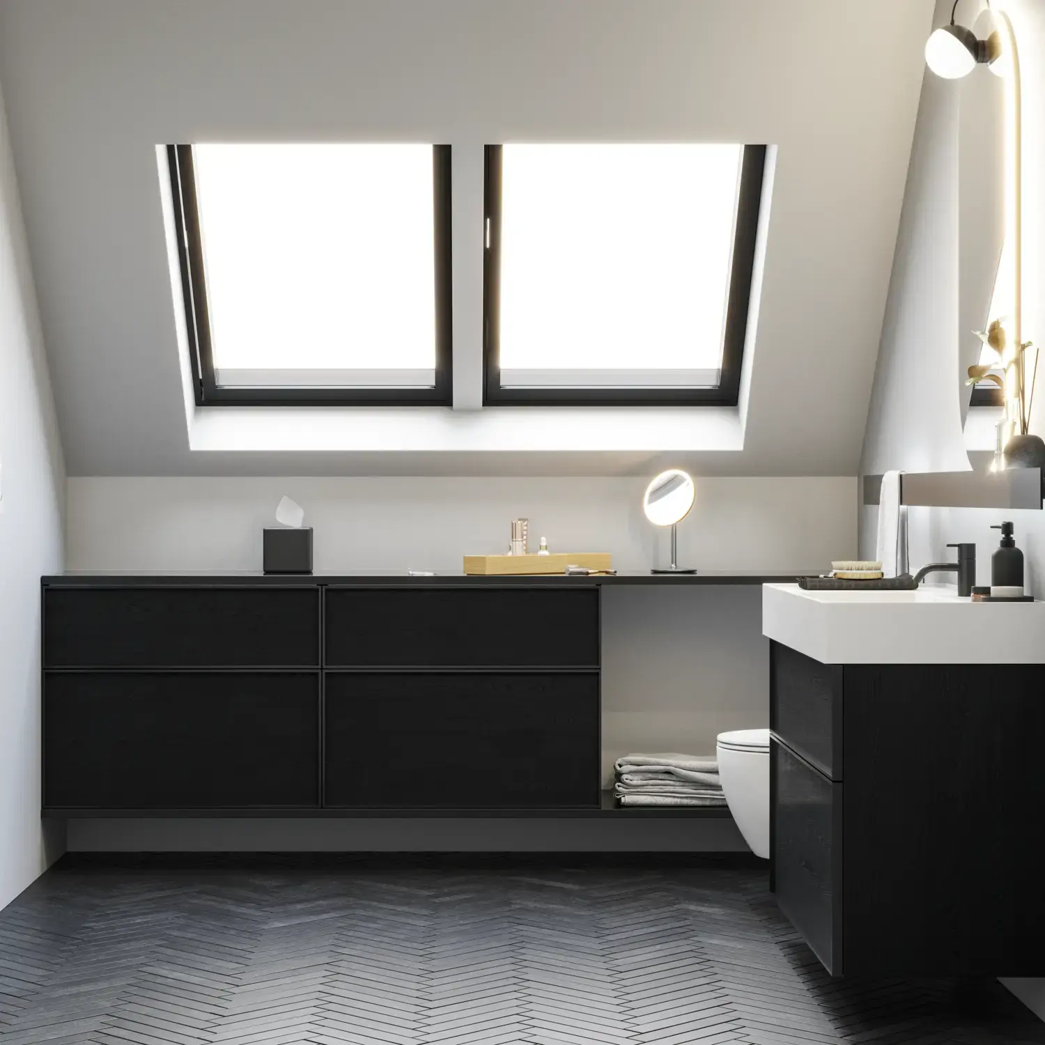 Snedtak eller sneda vinklar som du kanske har känt begränsningar med i ditt gamla badrum behöver inte vara ett hinder för att skapa ett stilfullt nytt badrum. Med specialtillverkade bänkskivor, asymmetriska tvättställ, runda speglar, svävande hyllor och liknande finns det många möjligheter att maximera utnyttjandet av utrymmet. Och det behöver definitivt inte vara kostsamt.