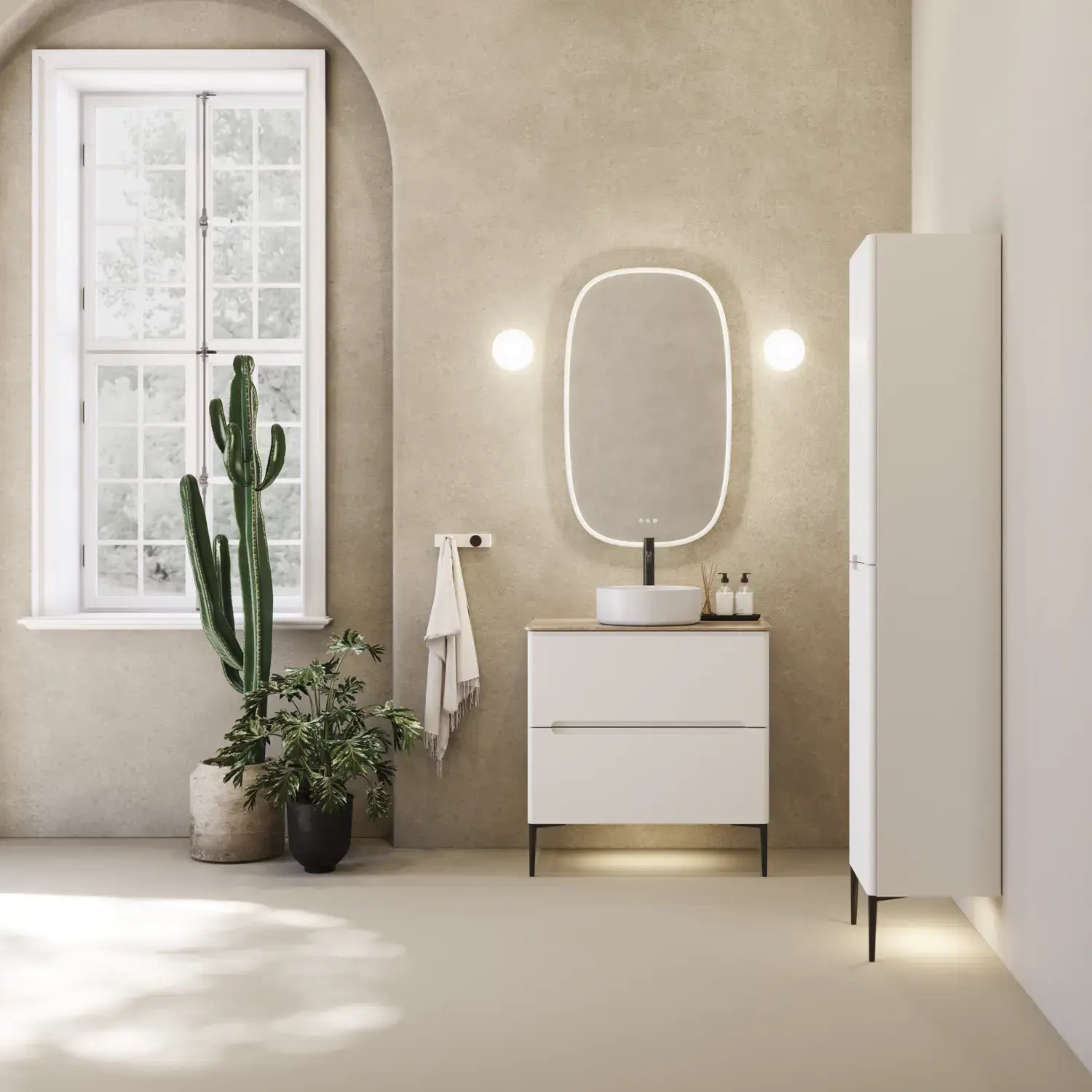 Om badrummet är smalt kan du prioritera golvutrymmet genom att välja en smal tvättställslösning utan att behöva ge avkall på bänkytan. Önskar du en längre sammanhängande avställningsyta kan en asymmetrisk tvättställslösning vara ett utmärkt förslag. Genom att välja ett spegelskåp istället för en enkel spegel kan du inte bara använda den för att spegla dig utan också utnyttja väggutrymmet till extra förvaring.