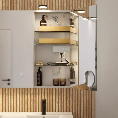 Vi använder enbart material av hög kvalitet i alla komponenter på våra spegelskåp. Därför är de bland annat utrustade med robusta metallgångjärn som enkelt kan justeras för att säkerställa en perfekt passform för luckorna på skåpet. Många av våra spegelskåp innehåller dessutom smarta funktioner, som tex: