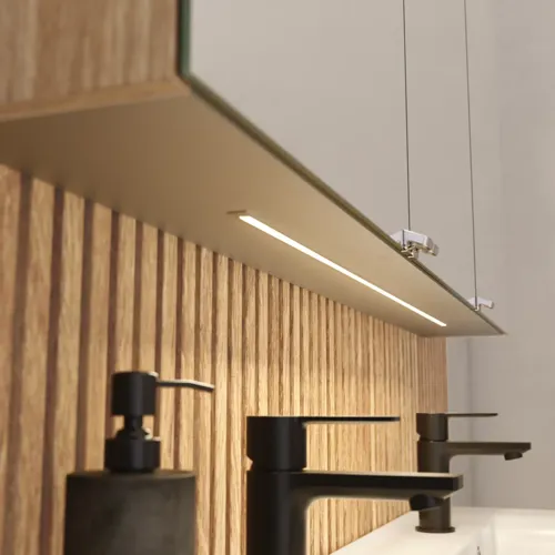 - Underlight – vissa spegelskåp kan levereras med en inbyggd LED-belysningsskena på undersidan, vilket ger en behaglig belysning ned över väggen och tvättstället.