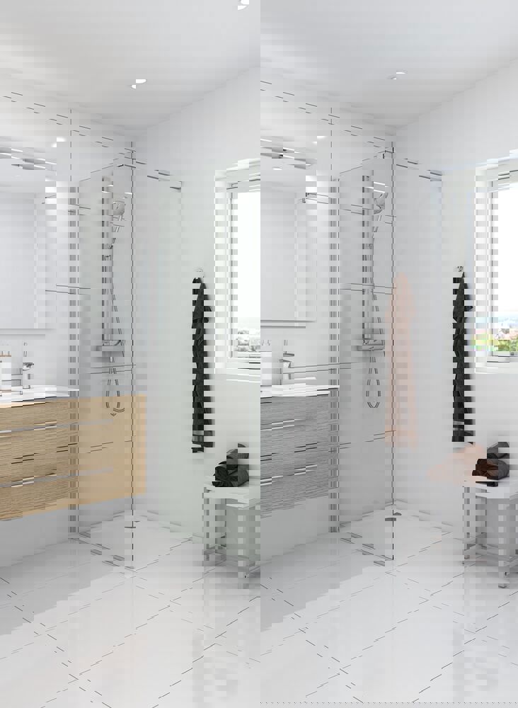De fasta väggar är designade med fokus på att skapa en rymlig och elegant duschplats som kan anpassas helt efter din personliga stil och badrumsinredning. Våra fasta väggar kan kombineras med andra duschväggar eller duschdörrar, vilket ger dig möjlighet att skapa en lösning som passar perfekt i ditt badrum. Kanske har du mycket utrymme och kan skapa en duschhörna? Eller kanske vill du kombinera den fasta väggen med en slagdörr för en stabil och säker lösning? Oavsett vad du väljer kan du hitta den lösning som passar dig bäst. Glaset i de fasta väggarna är behandlat med EasyCare, en specialbeläggning som motverkar avlagringar av smuts och tvålrester, vilket gör rengöringen mycket enklare. Glaset är dessutom härdat, och den kraftiga konstruktionen och de gedigna materialen gör att väggarna är stabila och pålitliga.