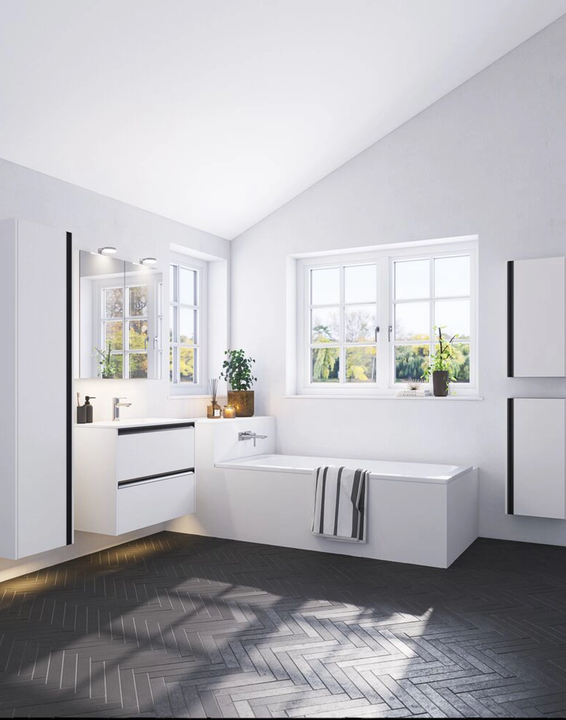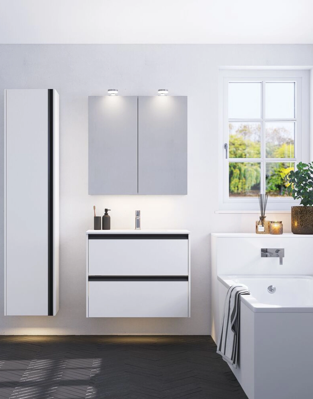 Högskåpet i version B med integrerat grepp är perfekt för dig som vill ha både stil och funktionalitet. Med en trähylla och tre förkortade glashyllor är detta skåp idealiskt för att förvara olika badrumsartiklar. De tre trälådorna på dörren är perfekta för små föremål, medan de två glashyllorna ger möjlighet att visa upp dina favoritprodukter. Det eleganta svarta greppet skapar en fin kontrast och tillför en sofistikerad touch till ditt badrum. OBS: Det tillkommer en startsavgift (BI1) för produkter med valfri färg. Den betalas en gång per valfri färg oavsett antal produkter. Kom ihåg att komplettera badrumsmöblerna med små, praktiska detaljr som du har glädje av varje dag. Exempelvis belysning i lådor och skåp, inbyggda eluttag och rörelsesensor på underbelysningen för att underlätta nattliga badrumsbesök. Dessa tillval beställs samtidigt som du köper dina möbler.