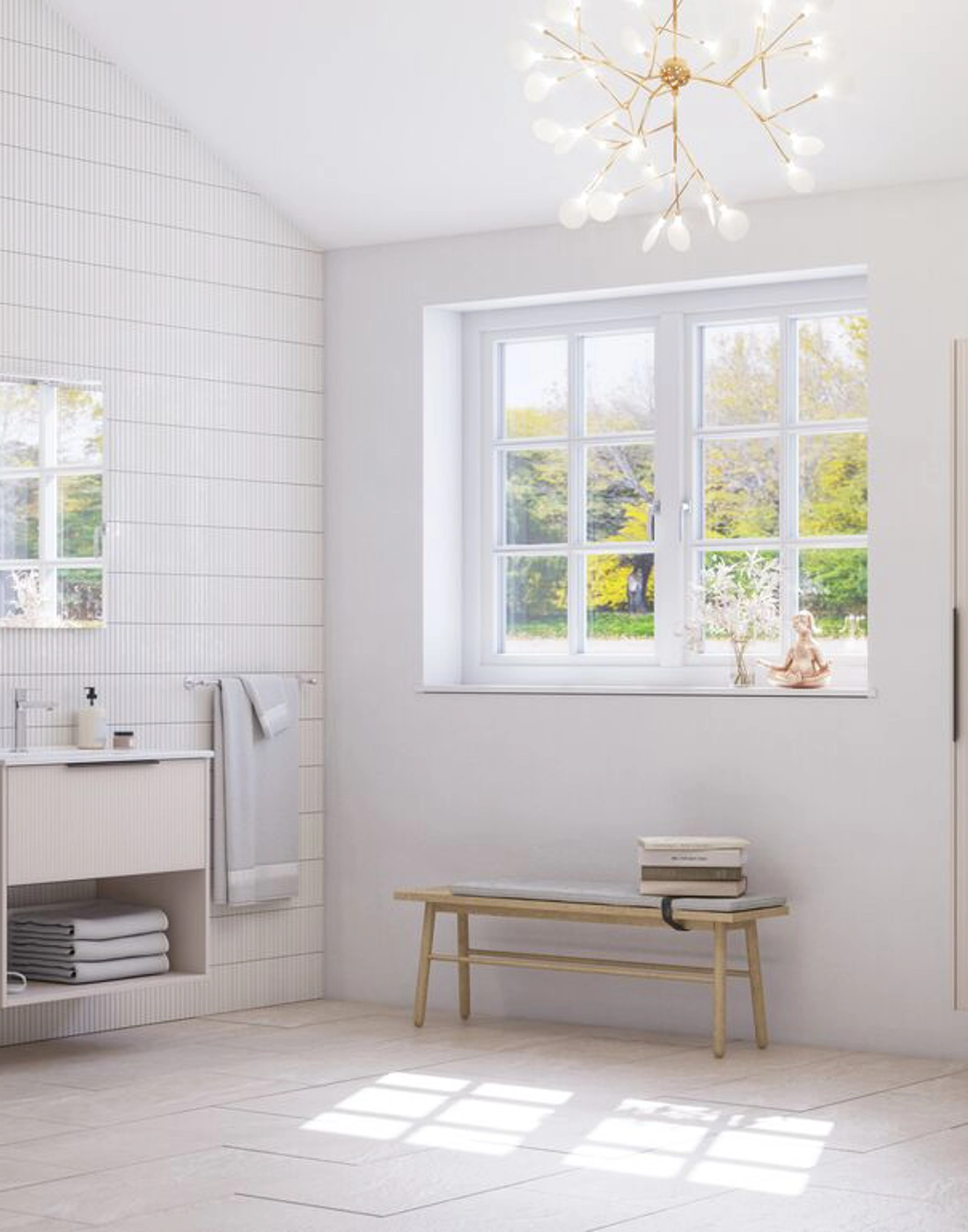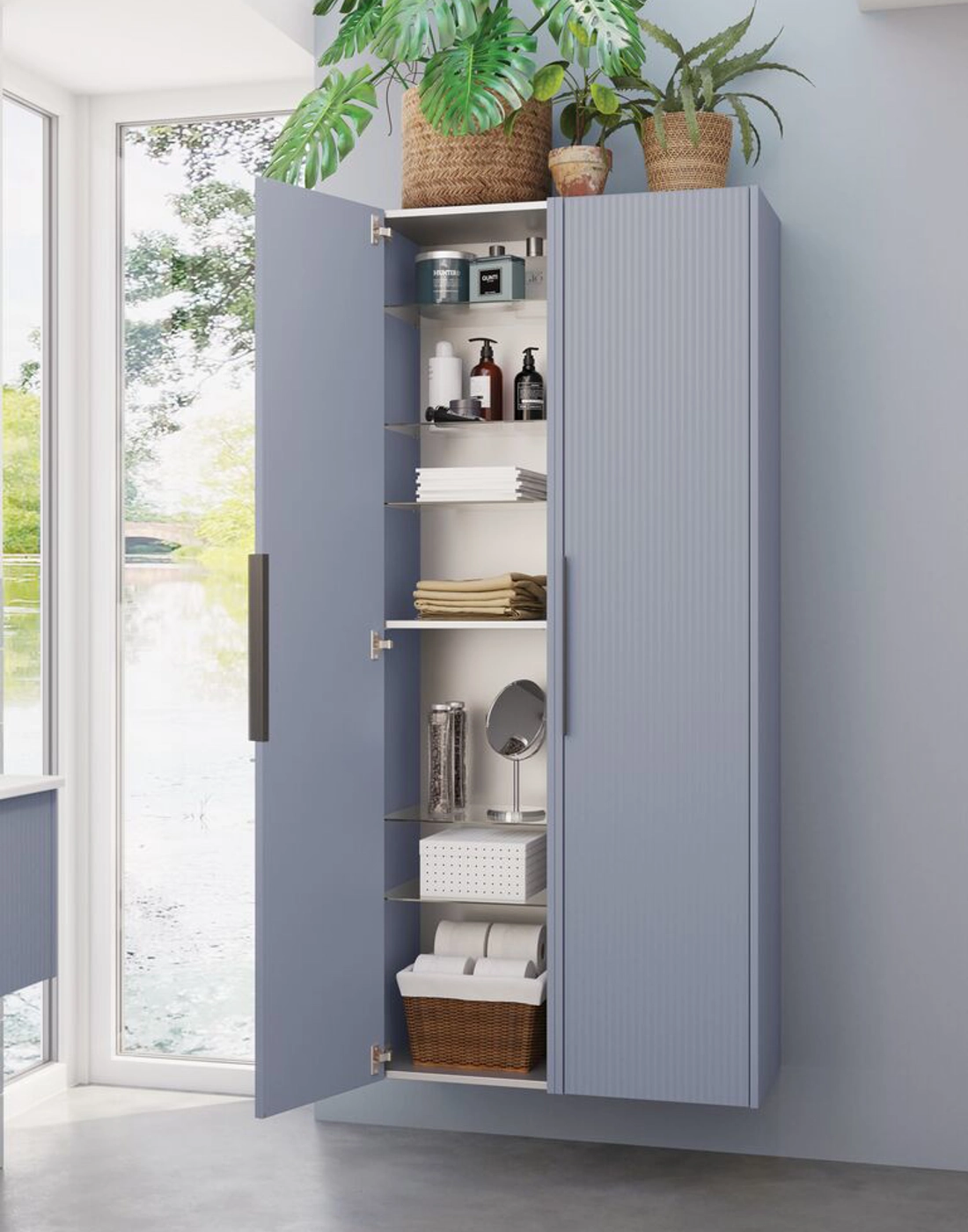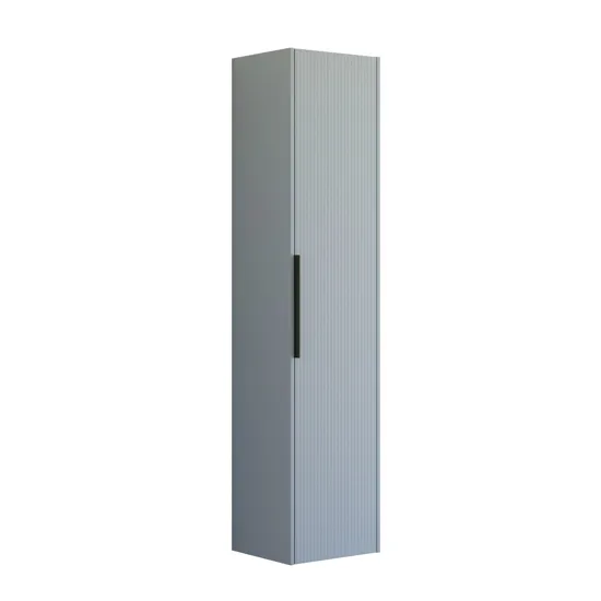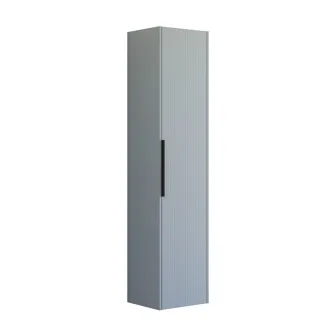 Detta höga skåp kombinerar flexibiliteten hos en vändbar dörr med en elegant randig front som ger en modern touch till ditt badrum. Inuti hittar du en trähylla och 4 glashyllor, vilket ger dig gott om utrymme för att organisera dina toalettartiklar. Skåpet finns i färgerna vit, sand eller ljusblå, och det monterade handtaget gör skåpet redo för omedelbar användning.