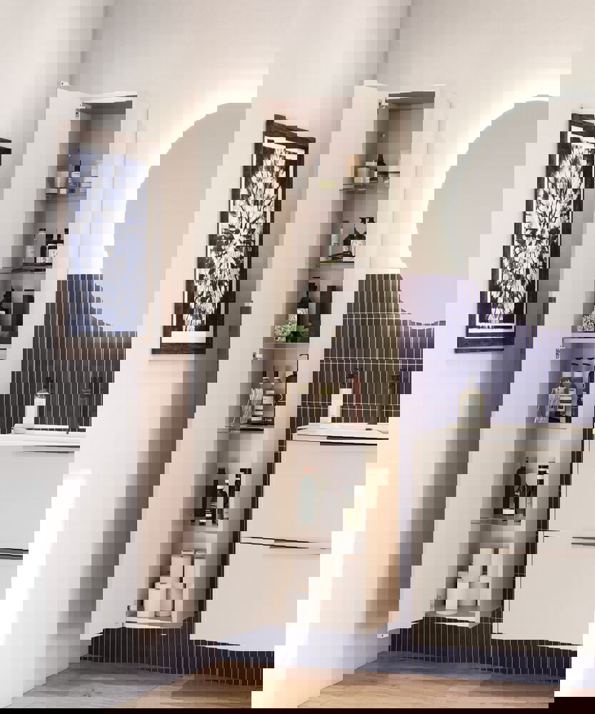 Det här högskåpet är utformat för flexibilitet och rymd. Med en vändbar dörr kan du anpassa skåpet till din inredning, oavsett vilken riktning du föredrar. Inuti hittar du en robust trähylla och 4 flyttbara glashyllor, vilket ger dig gott om förvaringsalternativ. Skåpet finns i färgerna vit, sand eller ljusblå och handtaget är monterat så att skåpet är klart att använda.