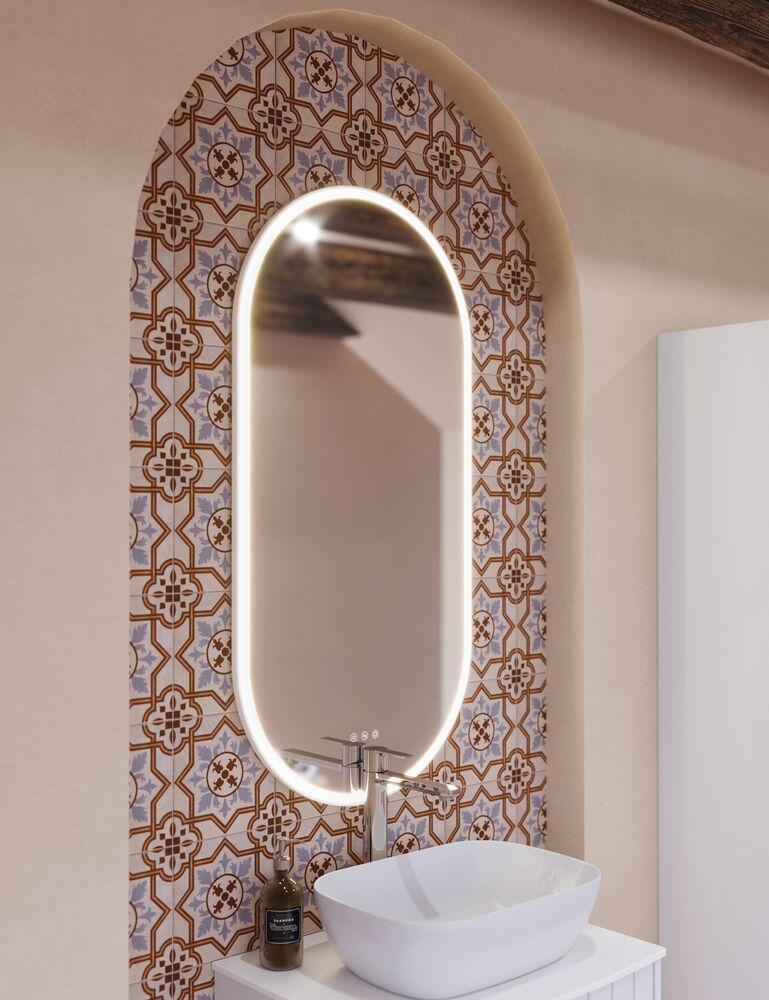 Den ovala Hoop-spegeln ger ett elegant och modernt utseende med sin unika svävande ram. Den böjda innerramen riktar ljuset jämnt framåt och skapar ett mjukt, diffust ljus som ger en behaglig belysning utan att blända. Spegeln är utrustad med ljusreglering så att du enkelt kan justera ljusstyrkan efter dina behov, oavsett om det gäller sminkning eller en avkopplande atmosfär. Hoop-spegeln levereras som standard med en svart ram, men den kan också fås i en specialmålad färg som matchar ditt badrum. Du kan köpa ett monterat värmefält för spegeln för att förhindra att spegeln immar igen när du duschar. OBS: Det tillkommer en startsavgift (BI1) för produkter med valfri färg. Den betalas en gång per valfri färg oavsett antal produkter.