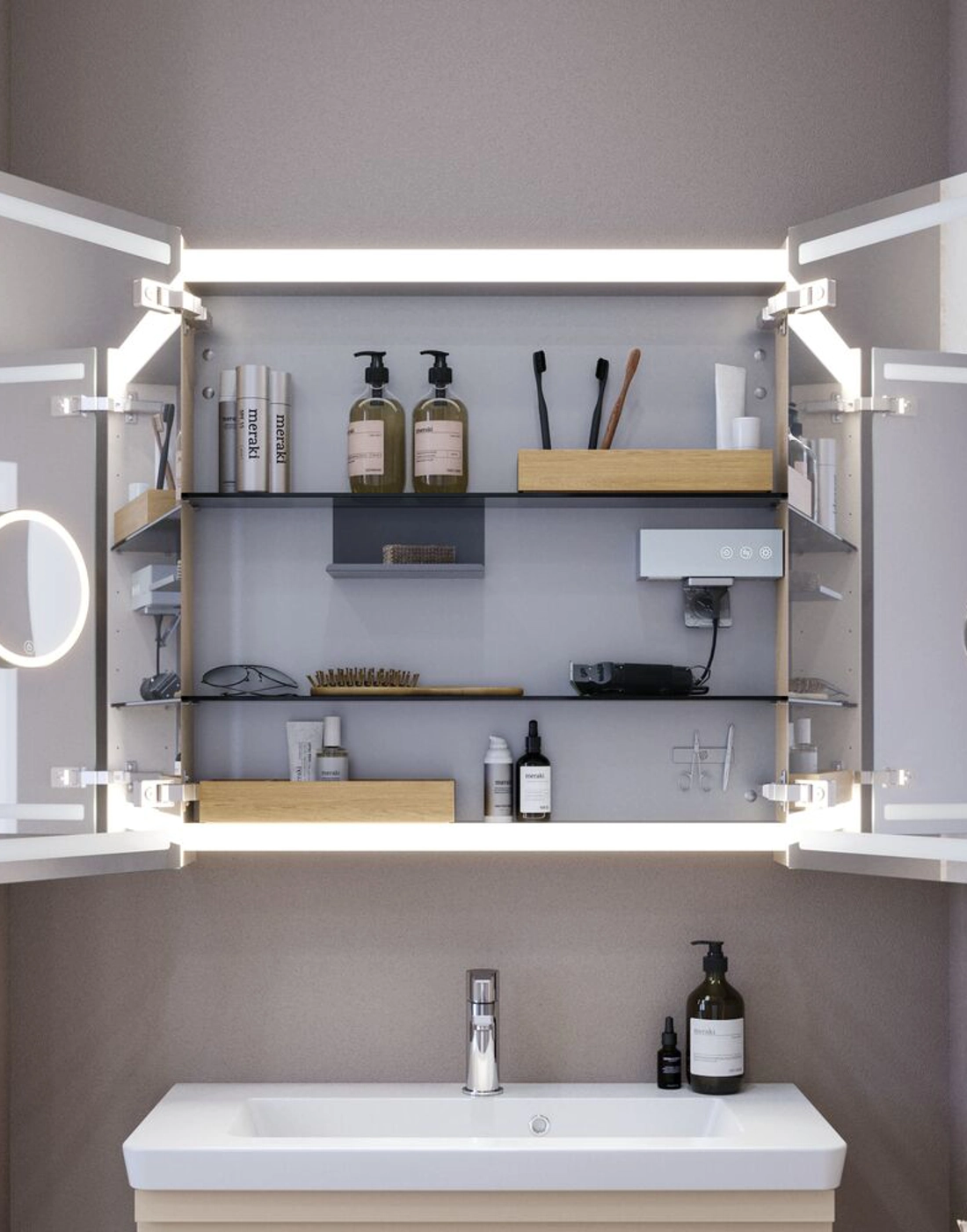 Spegelskåpet Level ger dig massor av extra förvaring i ditt badrum. I spegelskåpet hittar du flera hyllor, en förstoringsspegel, magnetskena, metallhylla och ett eluttag, vilket ger dig gott om utrymme för din tandborste, rakapparat, krämer, deodorant och mycket mer. Spegelskåpet har topp- och bottenbelysning som kan styras i både styrka och färgton, så att du kan få rätt ljus för dina behov. OBS: Det tillkommer en startsavgift (BI1) för produkter med valfri färg. Den betalas en gång per valfri färg oavsett antal produkter.