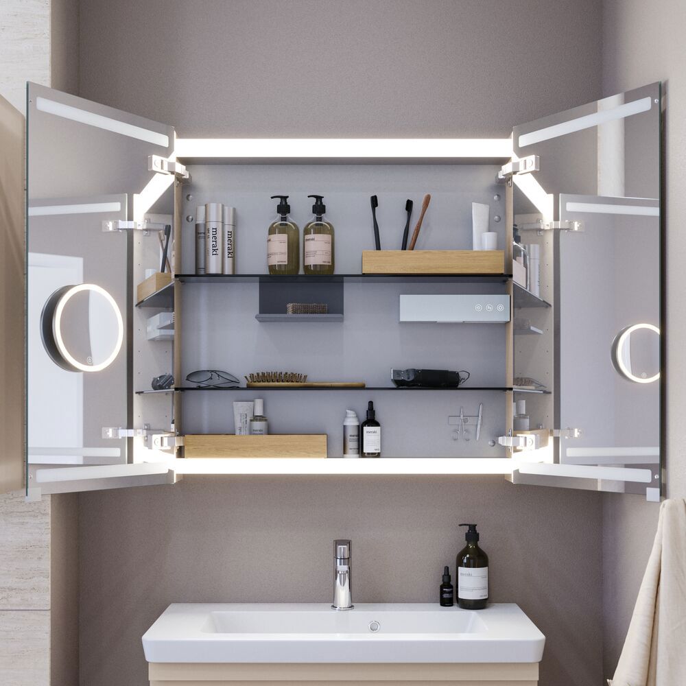 Spegelskåpet Level ger dig massor av extra förvaring i ditt badrum. I spegelskåpet hittar du flera hyllor, en förstoringsspegel, magnetskena, metallhylla och ett eluttag, vilket ger dig gott om utrymme för din tandborste, rakapparat, krämer, deodorant och mycket mer. Spegelskåpet har topp- och bottenbelysning som kan styras i både styrka och färgton, så att du kan få rätt ljus för dina behov. OBS: Det tillkommer en startsavgift (BI1) för produkter med valfri färg. Den betalas en gång per valfri färg oavsett antal produkter.