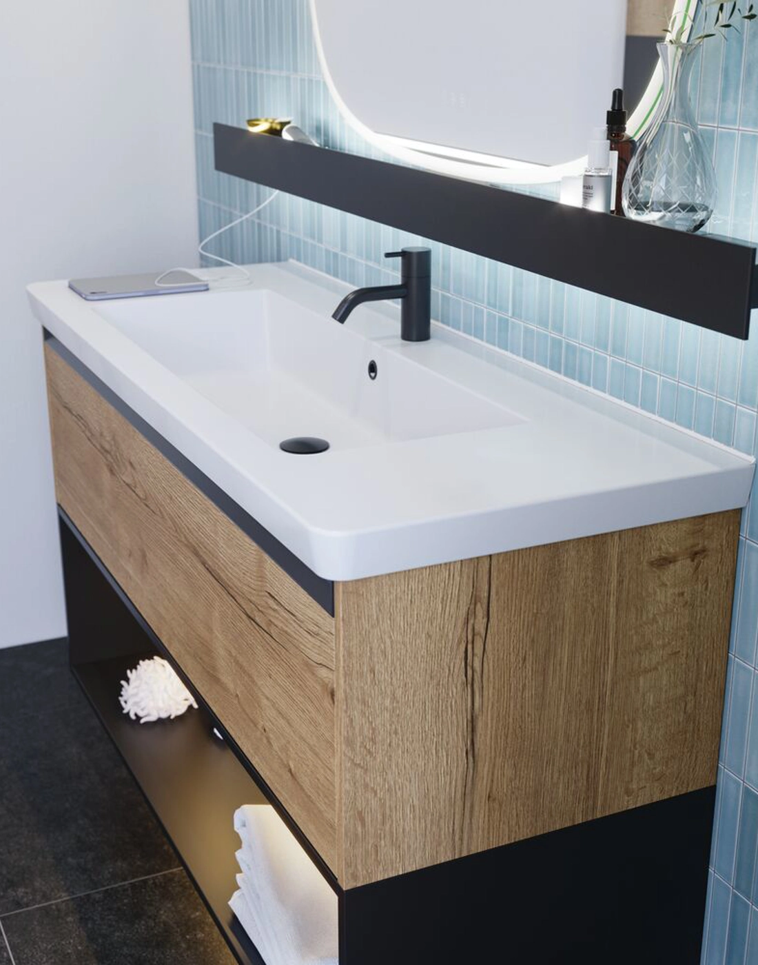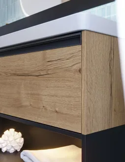 Den öppna hyllan är perfekt för att personifiera ditt badrum och göra det unikt. Den smarta öppna hyllan kan kombineras med ett tvättställsskåp och öppnar upp för en mängd olika inredningsalternativ. Skapa en skräddarsydd lösning genom att kombinera hyllan och tvättställsskåpet på ditt eget sätt och anpassa förvaringsutrymmet efter dina behov. Med den öppna hyllan har du en display för dina favoritsaker eller ett praktiskt fack för förvaring av handdukar, toalettpapper med mera. Lägg till lampor till dina öppna hyllor för extra effekt. Detta ger en subtil belysning som inte bara förbättrar presentationen, utan också skapar en trevlig atmosfär i ditt badrum. OBS: Det tillkommer en startsavgift (BI1) för produkter med valfri färg. Den betalas en gång per valfri färg oavsett antal produkter.