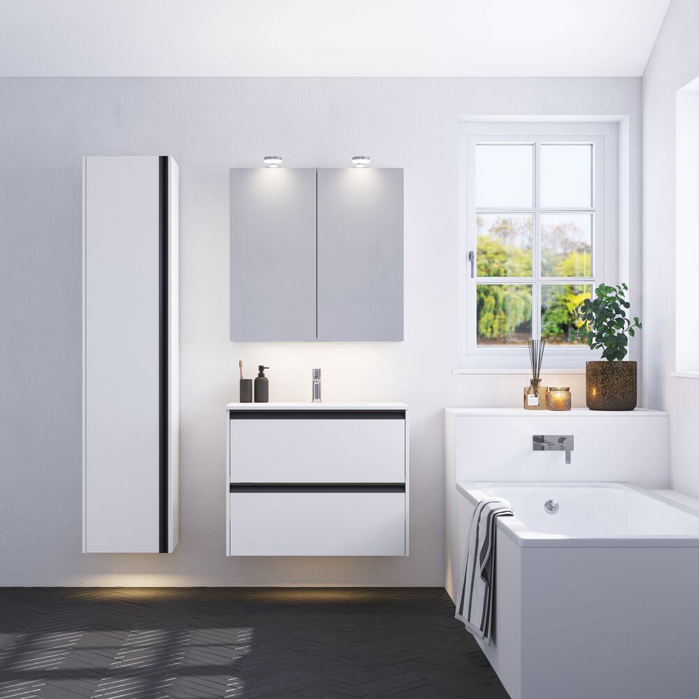 Ge ditt badrum en modern touch med ett väggskåp med integrerat handtag. Den enkla men stiliga designen av detta skåp gör det till en idealisk lösning för att optimera utrymmet. De två glas hyllorna ger möjlighet att visa upp dina badrumsartiklar och hålla dem organiserade. Med detta väggskåp får du inte bara praktisk förvaring, utan också en vacker detalj som kan kombineras med en öppen hylla, vilket tillför både funktionalitet och estetik till ditt badrum. OBS: Det tillkommer en startsavgift (BI1) för produkter med valfri färg. Den betalas en gång per valfri färg oavsett antal produkter. Kom ihåg att komplettera badrumsmöblerna med små, praktiska detaljr som du har glädje av varje dag. Exempelvis belysning i lådor och skåp, inbyggda eluttag och rörelsesensor på underbelysningen för att underlätta nattliga badrumsbesök. Dessa tillval beställs samtidigt som du köper dina möbler.