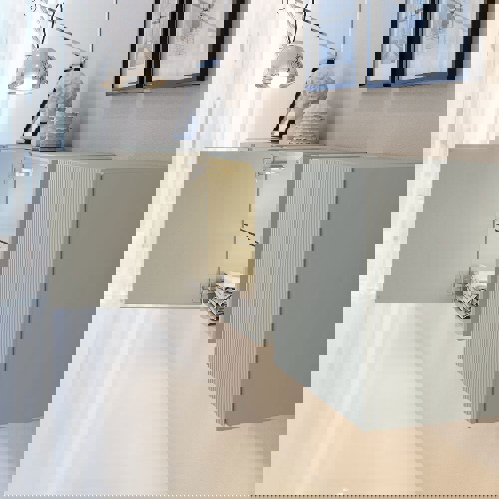 Skapa en mysig och inbjudande atmosfär med ett väggskåp med lamelfront. De två glas hyllorna ger rikligt med möjligheter att organisera och visa upp dina favoriter, samtidigt som den unika designen tillför karaktär till ditt badrum. Med en bredd på 40 cm och en djup på 19 cm är detta skåp perfekt för att maximera förvaringsutrymmet. När det kombineras med en öppen hylla får du en smart och stilren lösning som framhäver både funktionalitet och personlighet i rummet. Kom ihåg att komplettera badrumsmöblerna med små, praktiska detaljr som du har glädje av varje dag. Exempelvis belysning i lådor och skåp, inbyggda eluttag och rörelsesensor på underbelysningen för att underlätta nattliga badrumsbesök. Dessa tillval beställs samtidigt som du köper dina möbler.