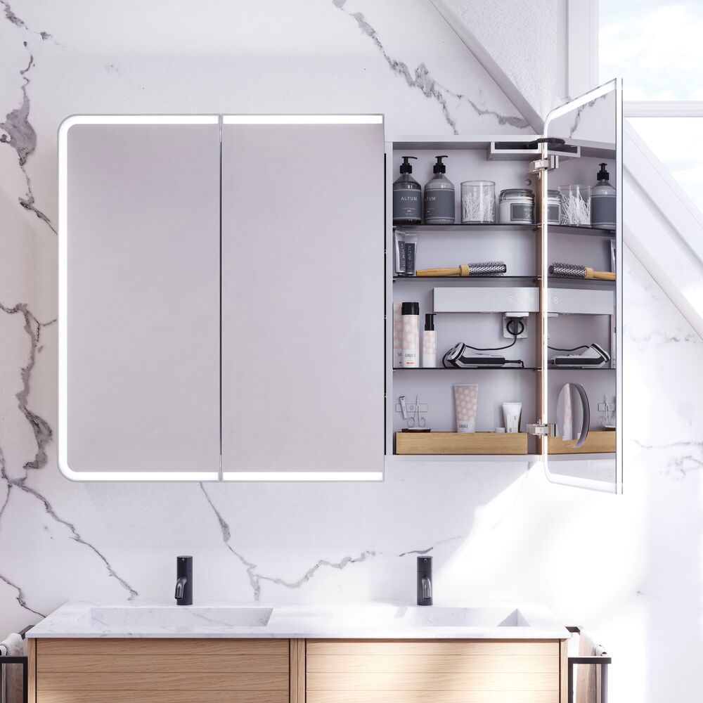 Spegelskåpet Radience kombinerar modern design och praktisk förvaring i ett. Bakom de eleganta spegeldörrarna hittar du gott om utrymme för dina dagliga toalettartiklar så att du enkelt kan hålla ditt badrum organiserat. Ljusramen runt kanten ramar vackert in din reflektion och skapar ett mysigt ljus som du kan styra trådlöst direkt från dörren. Med en antidimfunktion i spegeln och möjlighet att välja mellan olika storlekar och färger är Radience både en praktisk och snygg lösning - perfekt för dagens trend där badrummet ska vara både funktionellt och personligt. OBS: Det tillkommer en startsavgift (BI1) för produkter med valfri färg. Den betalas en gång per valfri färg oavsett antal produkter.