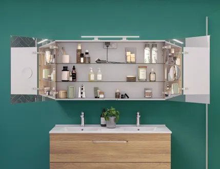 Spegelskåpet Select är mycket mer än bara ett spegelskåp - det är din personliga badrumsuppgradering. Välj dina egna lampor och skapa den perfekta belysningen för att starta dagen med stil. Med spegelskåpet får du gott om förvaringsutrymme och ett elluttag för dina elektriska apparater. Upplev bekvämlighet och elegans i ett med Select spegelskåp - din dagliga följeslagare för en strålande morgon.