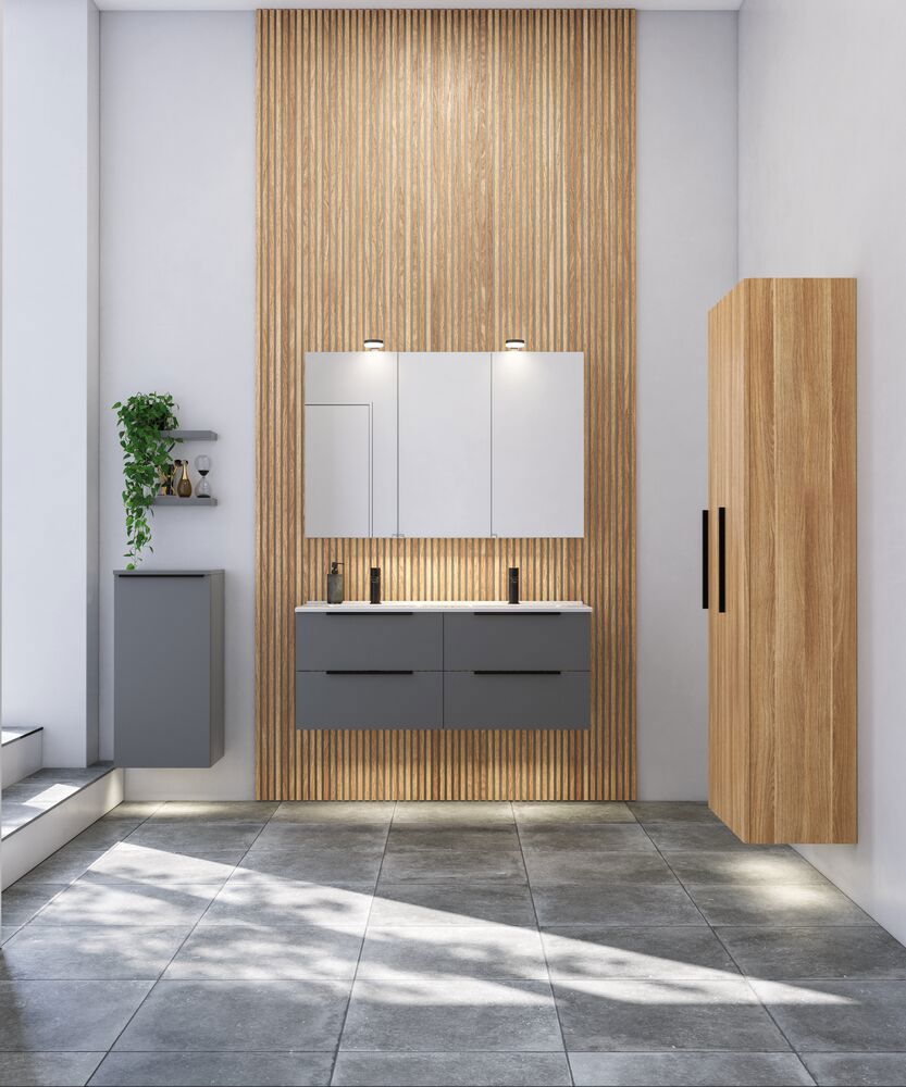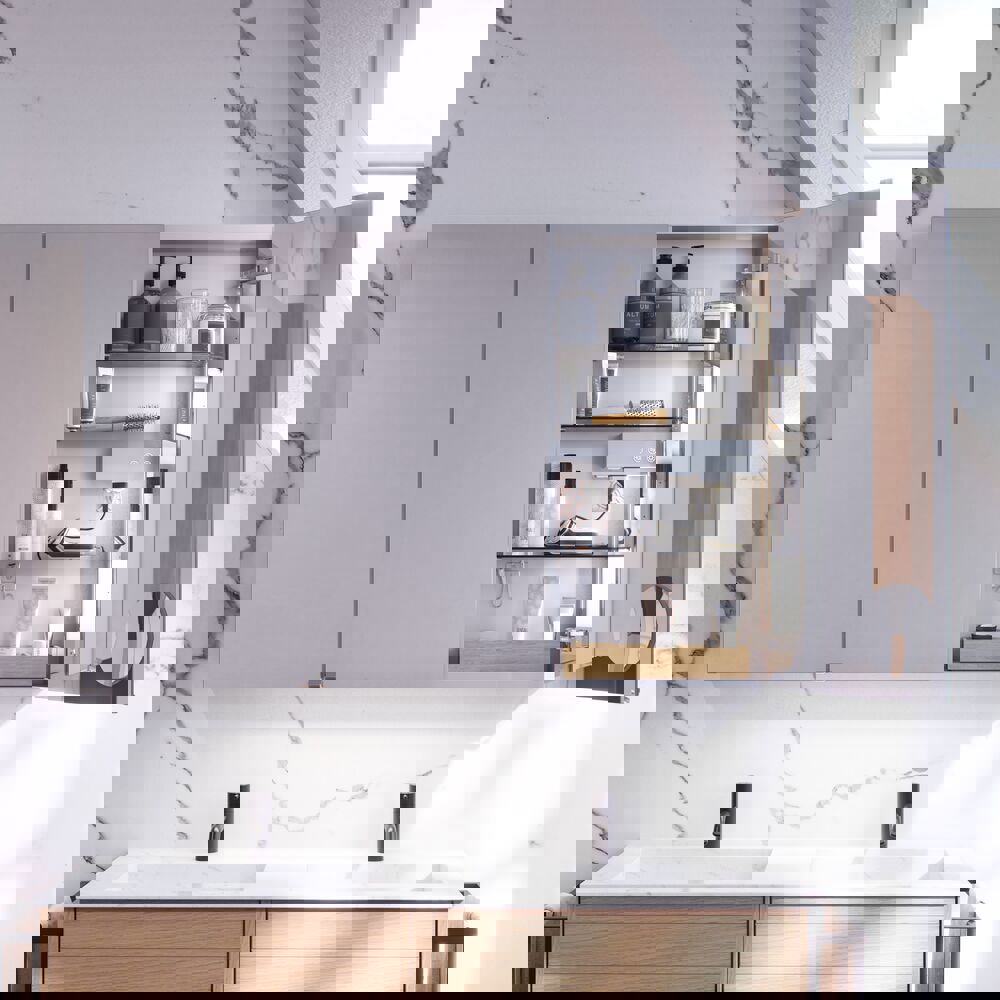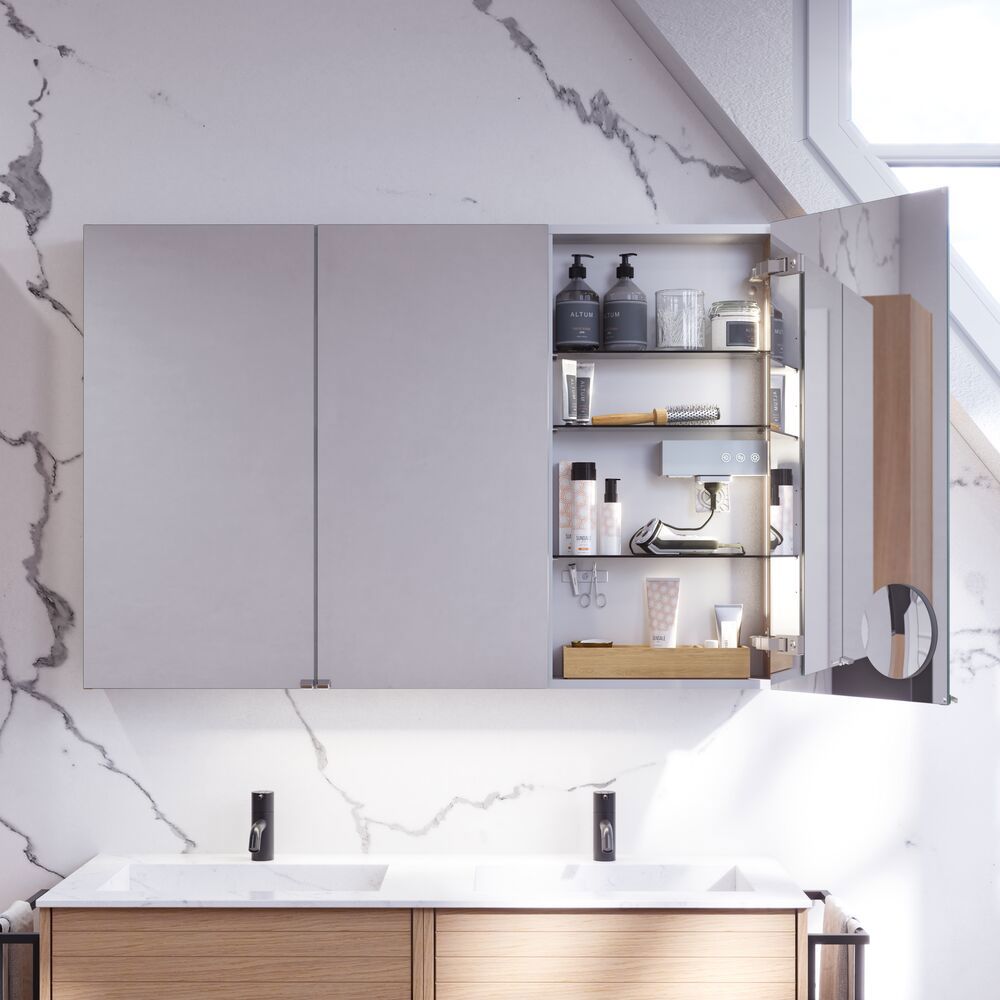Få praktisk förvaring och snygg design med Style spegelskåp. Spegelskåpet är perfekt för förvaring av alla dina krämer, deodoranter, nagelklippare, tandborstar och mycket mer. Välj till lampor till spegelskåpet och styr ljusets färgton och styrka med ett enkelt tryck. Det vackra spegelskåpet innehåller en magnetisk skena, metallhylla, förstoringsspegel och eluttag, vilket gör din morgon- och kvällsrutin mycket enklare. OBS: Det tillkommer en startsavgift (BI1) för produkter med valfri färg. Den betalas en gång per valfri färg oavsett antal produkter.