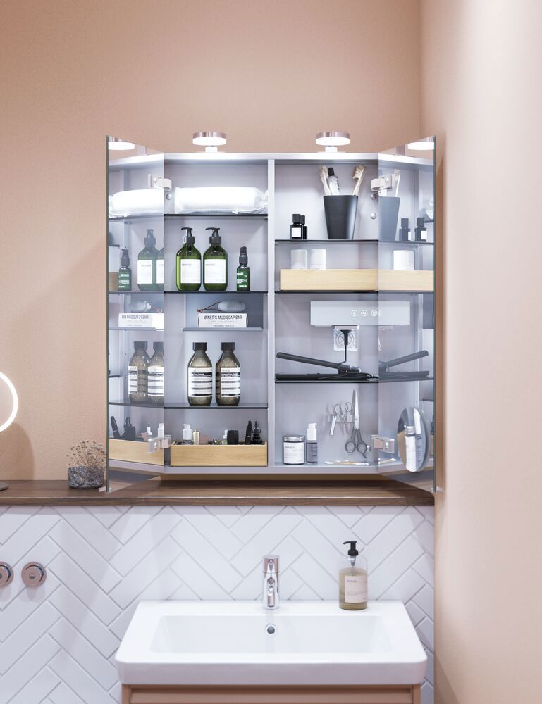 Få praktisk förvaring och snygg design med Style spegelskåp. Spegelskåpet är perfekt för förvaring av alla dina krämer, deodoranter, nagelklippare, tandborstar och mycket mer. Välj till lampor till spegelskåpet och styr ljusets färgton och styrka med ett enkelt tryck. Det vackra spegelskåpet innehåller en magnetisk skena, metallhylla, förstoringsspegel och eluttag, vilket gör din morgon- och kvällsrutin mycket enklare. OBS: Det tillkommer en startsavgift (BI1) för produkter med valfri färg. Den betalas en gång per valfri färg oavsett antal produkter.