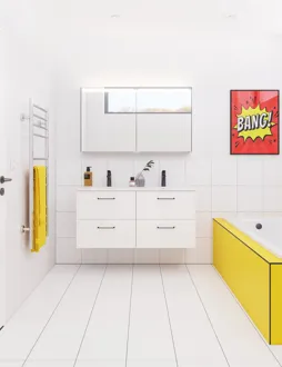 Ta din morgon till nya höjder med Top spegelskåp. Spegelskåpet har en belysning upptill, och i spegelskåpet hittar du gott om förvaringsutrymme och ett eluttag med strömbrytare. Så du får mycket mer än du kanske förväntar dig. Spegelskåpet finns naturligtvis med gavlar i livfulla färger, så att du kan matcha spegelskåpet med dina badrumsmöbler och resten av badrummet.