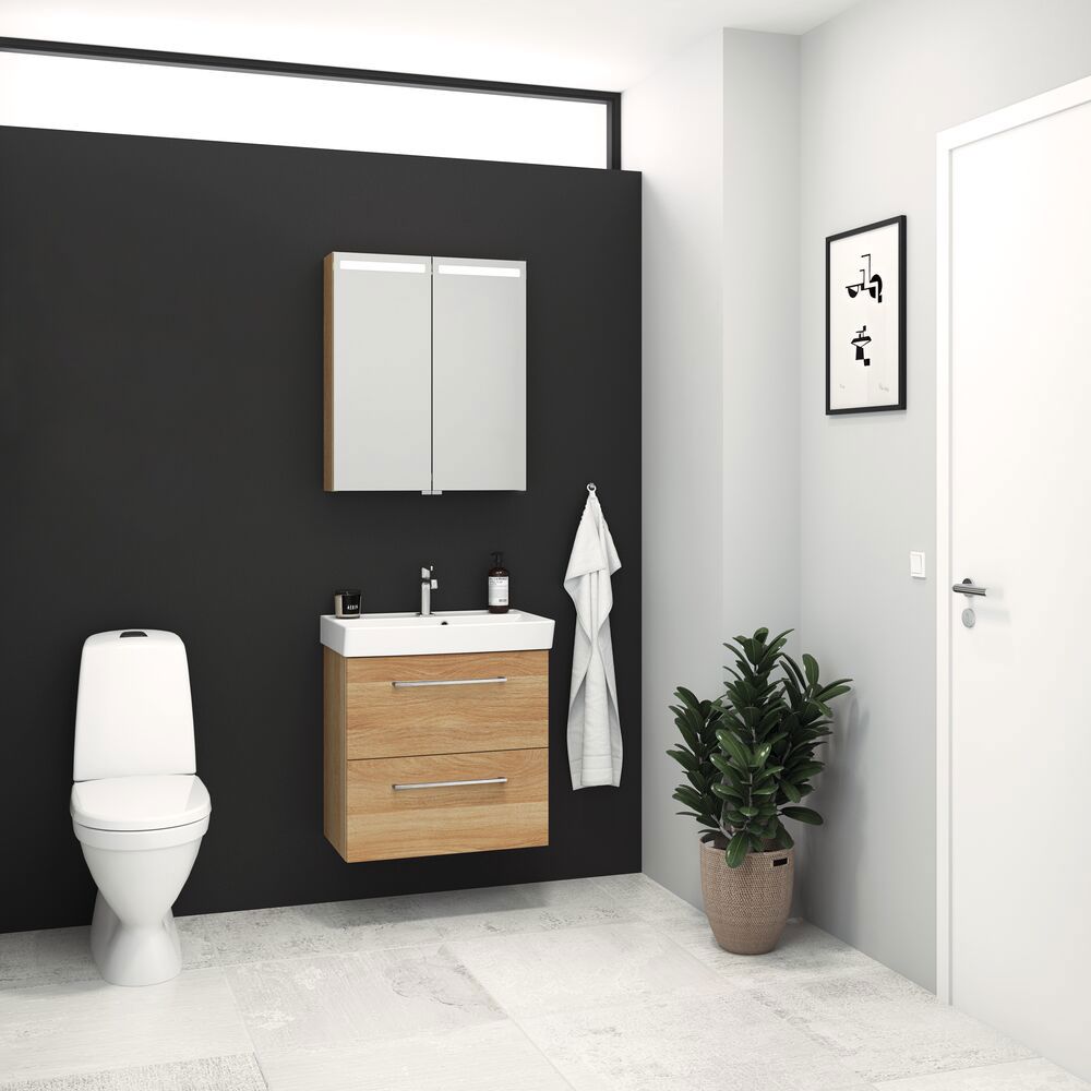 Ta din morgon till nya höjder med Top spegelskåp. Spegelskåpet har en belysning upptill, och i spegelskåpet hittar du gott om förvaringsutrymme och ett eluttag med strömbrytare. Så du får mycket mer än du kanske förväntar dig. Spegelskåpet finns naturligtvis med gavlar i livfulla färger, så att du kan matcha spegelskåpet med dina badrumsmöbler och resten av badrummet.
