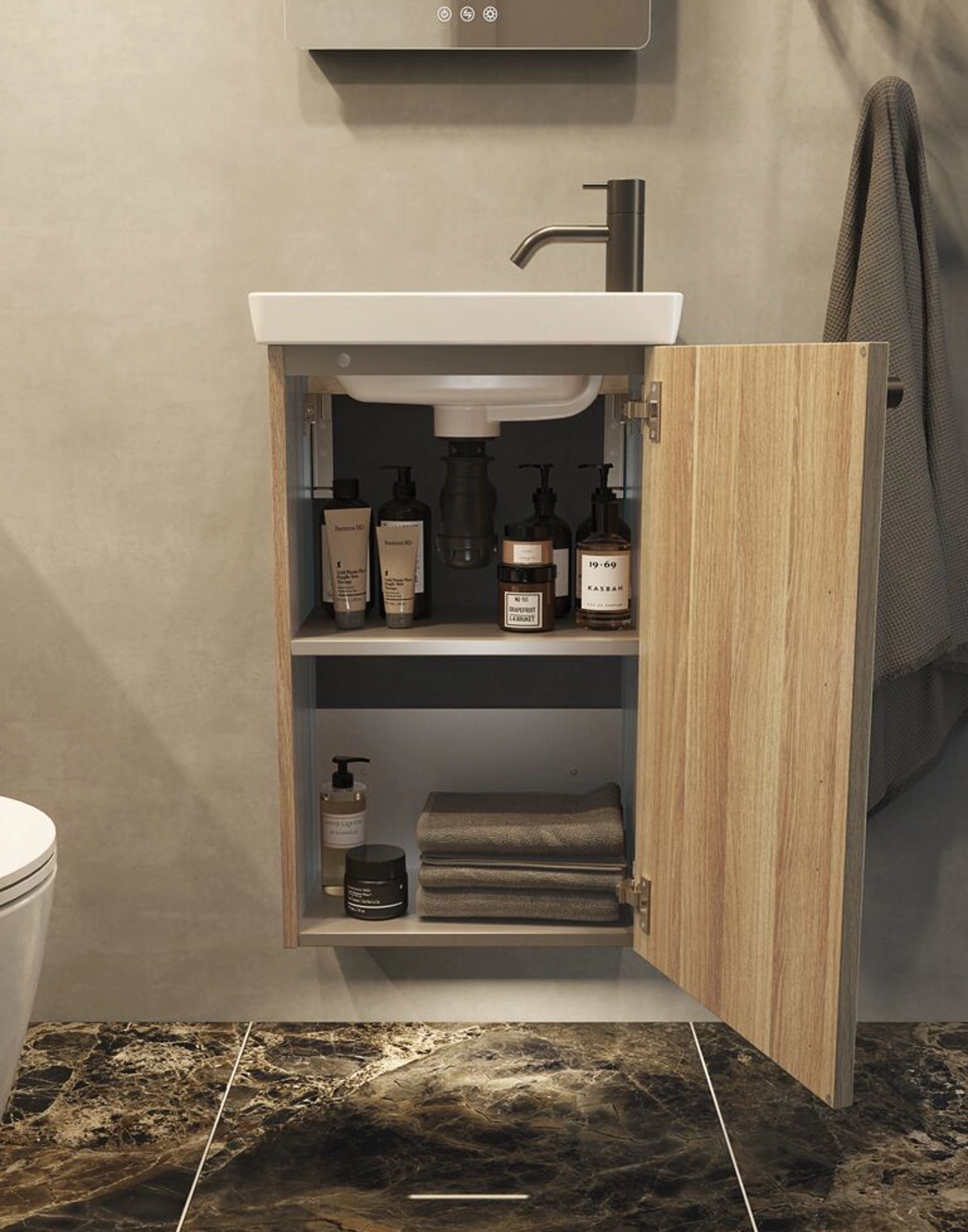 Tvättställsskåpet med 1 lucka är den perfekta lösningen för små badrum. Med ett djup på endast 26 cm tar den upp minimalt med utrymme, men du får ändå ett skåp med praktisk förvaring. Den eleganta designen passar perfekt med alla inredningar. Skåpet är både funktionellt och estetiskt tilltalande och hjälper till att skapa ordning och elegans i ditt badrum. Uppgradera ditt badrum med detta tvättställskåp och njut av den smarta utrymmesbesparande lösningen. OBS: Det tillkommer en startsavgift (BI1) för produkter med valfri färg. Den betalas en gång per valfri färg oavsett antal produkter. Kom ihåg att komplettera badrumsmöblerna med små, praktiska detaljr som du har glädje av varje dag. Exempelvis belysning i lådor och skåp, inbyggda eluttag och rörelsesensor på underbelysningen för att underlätta nattliga badrumsbesök. Dessa tillval beställs samtidigt som du köper dina möbler.