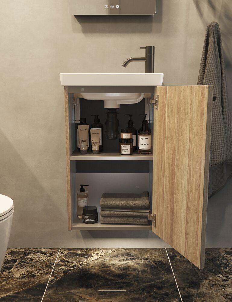 Tvättställsskåpet med 1 lucka är den perfekta lösningen för små badrum. Med ett djup på endast 26 cm tar den upp minimalt med utrymme, men du får ändå ett skåp med praktisk förvaring. Den eleganta designen passar perfekt med alla inredningar. Skåpet är både funktionellt och estetiskt tilltalande och hjälper till att skapa ordning och elegans i ditt badrum. Uppgradera ditt badrum med detta tvättställskåp och njut av den smarta utrymmesbesparande lösningen. OBS: Det tillkommer en startsavgift (BI1) för produkter med valfri färg. Den betalas en gång per valfri färg oavsett antal produkter. Kom ihåg att komplettera badrumsmöblerna med små, praktiska detaljr som du har glädje av varje dag. Exempelvis belysning i lådor och skåp, inbyggda eluttag och rörelsesensor på underbelysningen för att underlätta nattliga badrumsbesök. Dessa tillval beställs samtidigt som du köper dina möbler.