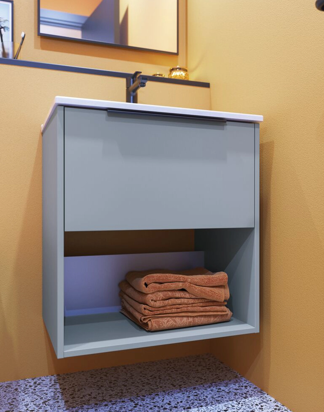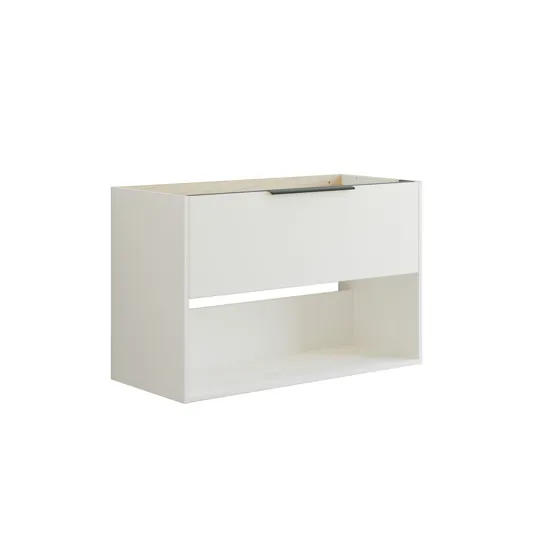 Här får du både förvaringsutrymme och möjlighet att visa upp dina favoritsaker. Detta underskåp har en praktisk låda och ett öppet fack som är perfekt för att visa upp dina fina handdukar eller dekorativa föremål. Finns i tre eleganta färger: vit, sand och ljusblå. Lådan är rymlig och det matchande handtaget är monterat så att den är klar att använda.
