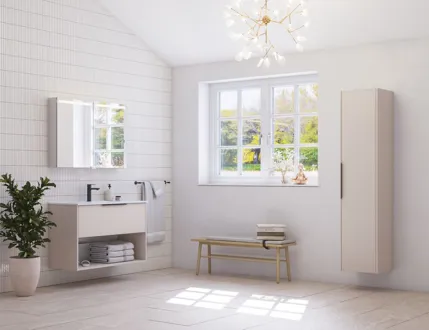 Det här underskåpet kombinerar det bästa av två världar: en praktisk låda, ett öppet utrymme för att visa dina favoritsaker och en randig front för ett unikt och elegant utseende. Välj mellan färgerna vit, sand eller ljusblå för att hitta den som passar bäst i ditt badrum. Handtaget är redan monterat så det är klart att använda.