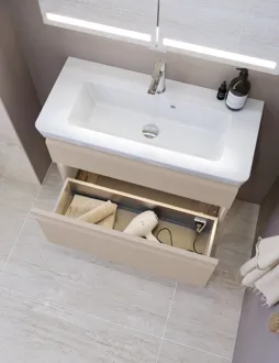 Ett tvättställsskåp med lådor är den ideala lösningen för ditt badrum. Med en djup på endast 35 cm är det perfekt för mindre utrymmen. Den höga underlådan ger extra förvaringsutrymme för större badrumsartiklar, så att du enkelt kan hålla ordning. Med det integrerade handtaget får du både funktionalitet och en stilren design som gör det möjligt att organisera dina saker elegant och praktiskt. OBS: Det tillkommer en startsavgift (BI1) för produkter med valfri färg. Den betalas en gång per valfri färg oavsett antal produkter. Kom ihåg att komplettera badrumsmöblerna med små, praktiska detaljr som du har glädje av varje dag. Exempelvis belysning i lådor och skåp, inbyggda eluttag och rörelsesensor på underbelysningen för att underlätta nattliga badrumsbesök. Dessa tillval beställs samtidigt som du köper dina möbler.