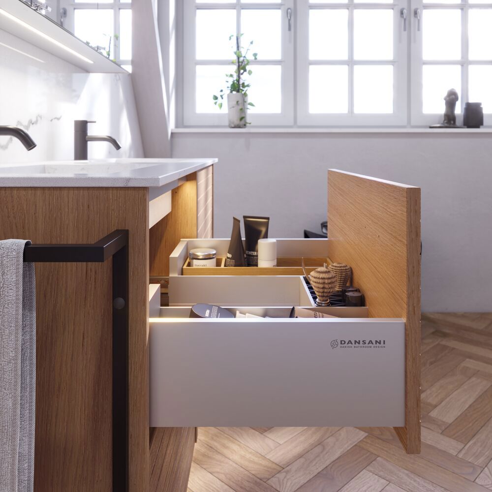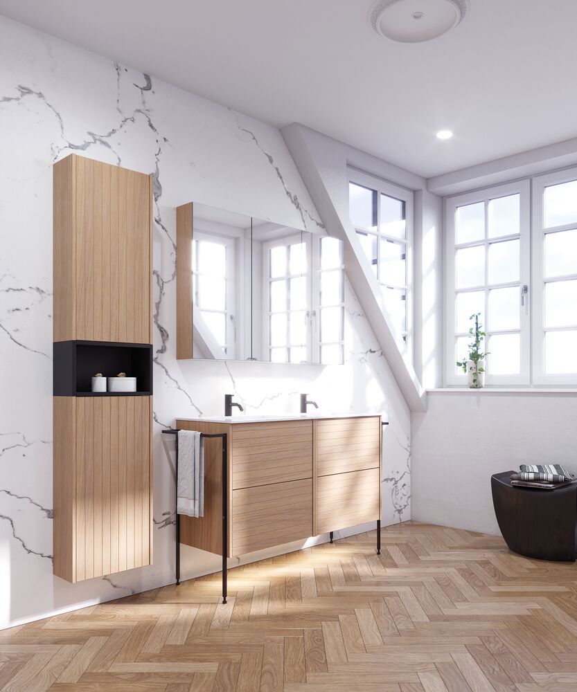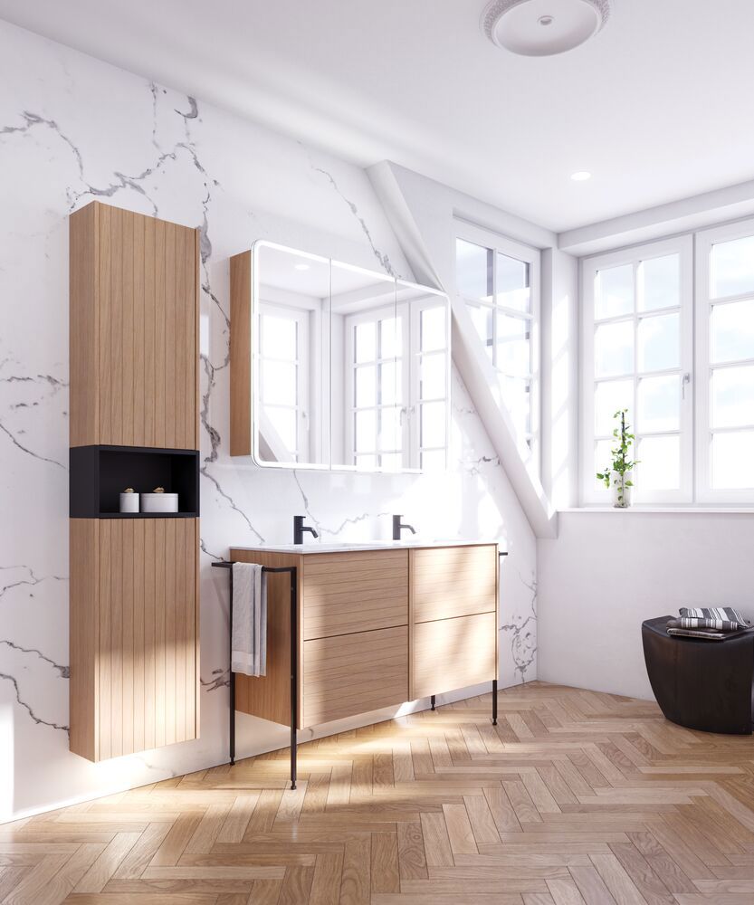 Skapa en unik stil i ditt badrum med tvättställsskåpet med lamelfront. De två lådorna, som är 32 cm höga, ger dig optimal förvaringsplats för att hålla ordning på dina badrumsartiklar. Lamelfronten ger ett karaktäristiskt och modernt utseende som sticker ut och tillför personlighet till ditt rum. Detta skåp kombinerar funktionalitet med estetik och är den perfekta lösningen för den som vill ha ett badrum som är både praktiskt och stilfullt. Kom ihåg att komplettera badrumsmöblerna med små, praktiska detaljr som du har glädje av varje dag. Exempelvis belysning i lådor och skåp, inbyggda eluttag och rörelsesensor på underbelysningen för att underlätta nattliga badrumsbesök. Dessa tillval beställs samtidigt som du köper dina möbler.