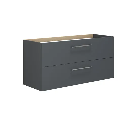 Här är ett vackert tvättställsskåp från Dansani Mido+ med 2 lådor och plats för dubbel bassäng i tvättstället . Den 120 cm breda tvättställsskåpet är den perfekta lösningen om du har lite extra utrymme i ditt badrum. Du kan använda både ett 120 cm enkelt tvättställ och ett 120 cm dubbelt tvättställ. Med ett dubbel tvättställ kan du ha flera personer vid tvättstället samtidigt, och ni kan till och med ha varsin bassäng. Tvättställsslåpet är med 2 lådor för extra förvaring av alla dina badrumsartiklar. Alla Mido+ skåp levereras med det klassiska Base-greppet i krom. Du kan välja ett annat handtag för att få en annan look, men kom ihåg att det måste beställas tillsammans med dina möbler. Kom ihåg att komplettera badrumsmöblerna med små, praktiska detaljr som du har glädje av varje dag. Till exempel belysning och trälådor till dina lådor.