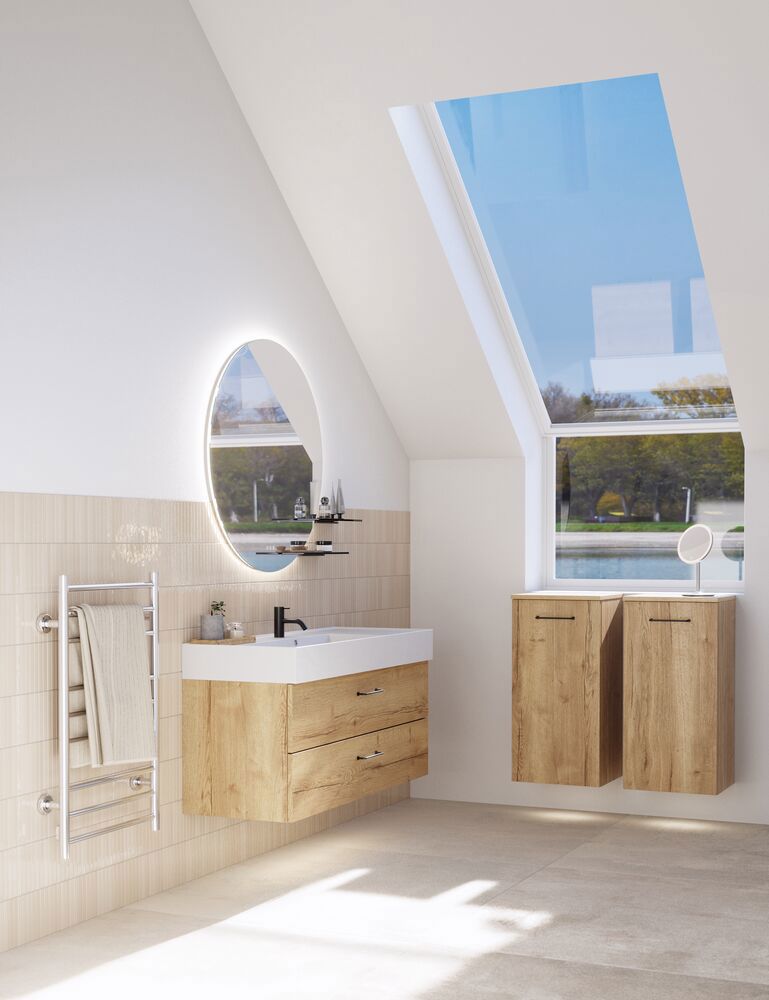Om du har en snedvägg i ditt badrum är ett tvättställsskåp i kombination med ett skåp en bra idé. Med ett asymmetriskt handfat kan du låta underskåpen stå under den sneda väggen och tvättställsskåpet med tvättstället stå längre in i rummet. På så sätt kan du utnyttja alla dina kvadratmeter i badrummet och få förvaringsutrymme även med begränsat utrymme. Läs mer om badrum och lutande väggar här.