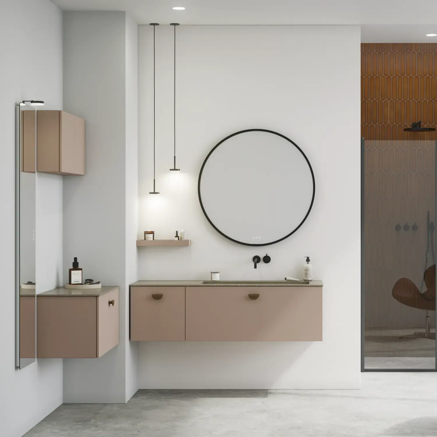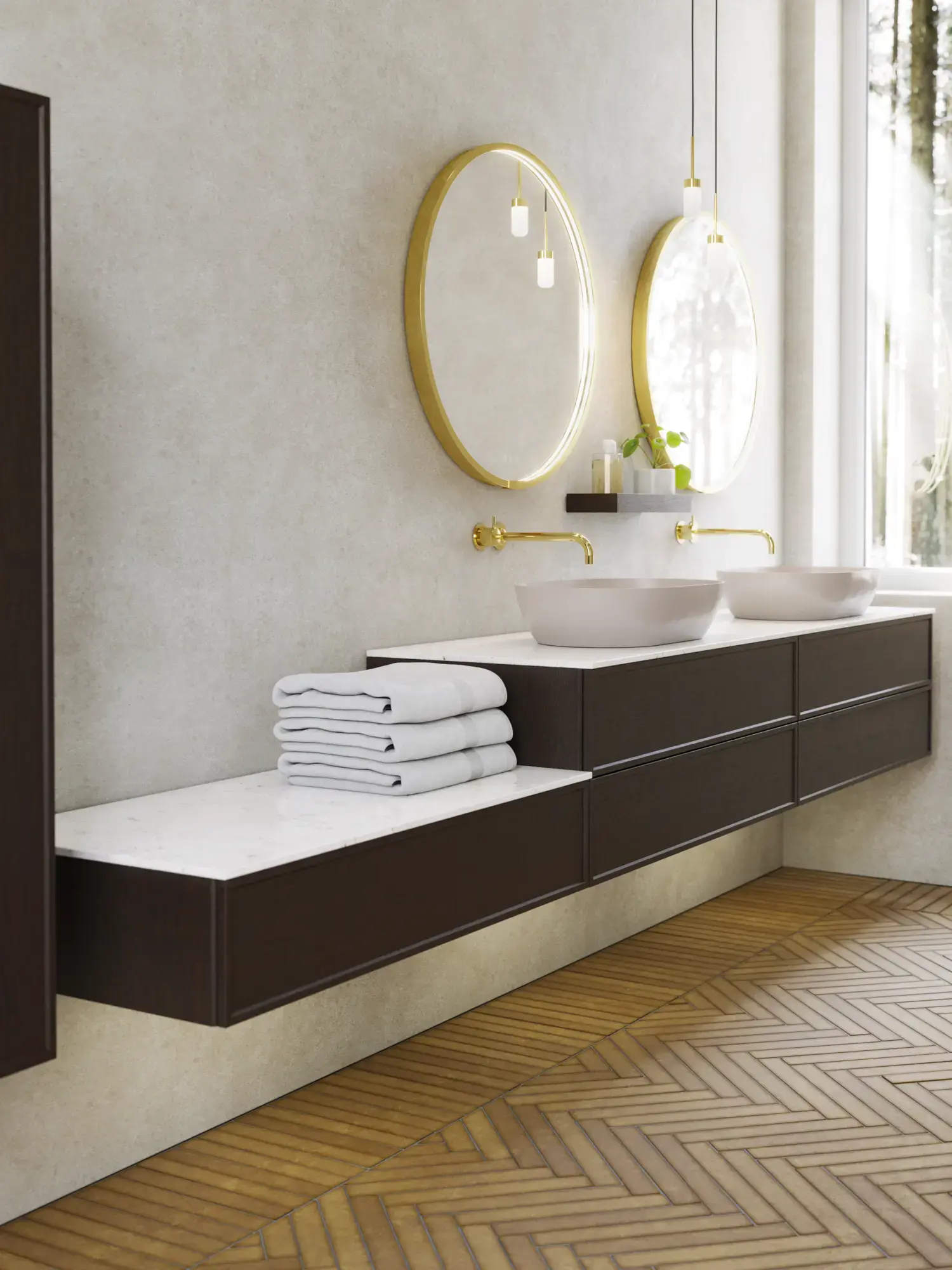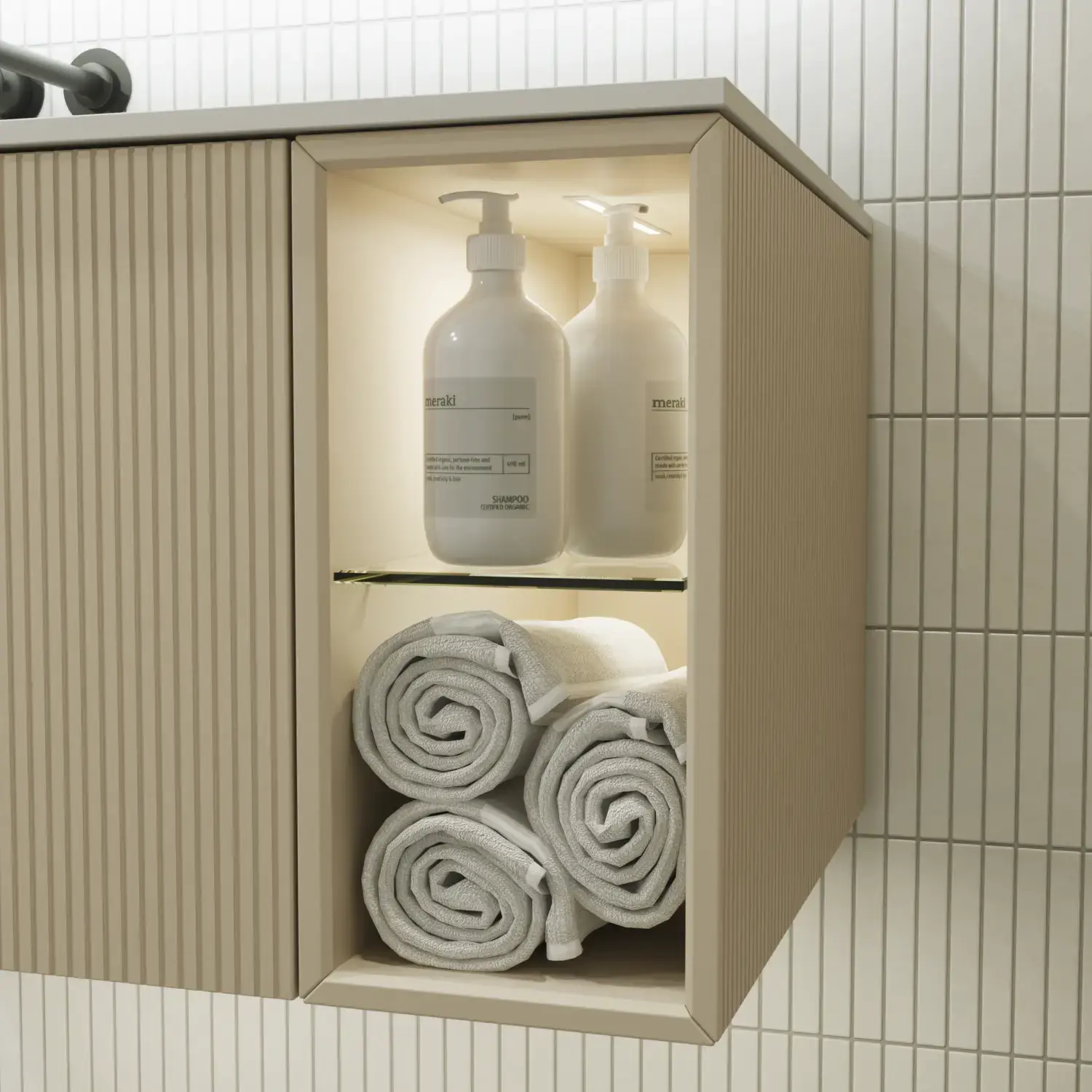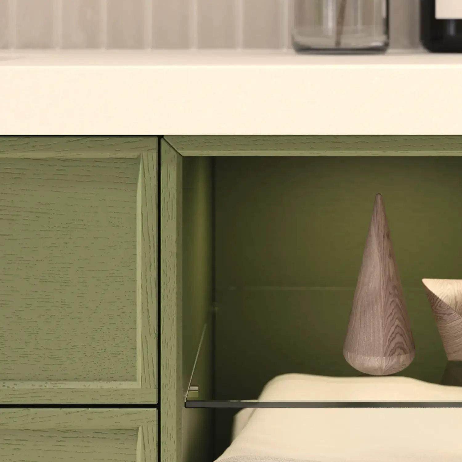 När estetik och funktion smälter samman uppstår ett rum i perfekt balans. Med Calidris kan du inreda hela badrummet i ett sammanhängande uttryck – från de eleganta spegelskåpen och öppna hyllorna till de vägghängda högskåpen med belysning undertill.De rena linjerna, de taktila fronterna