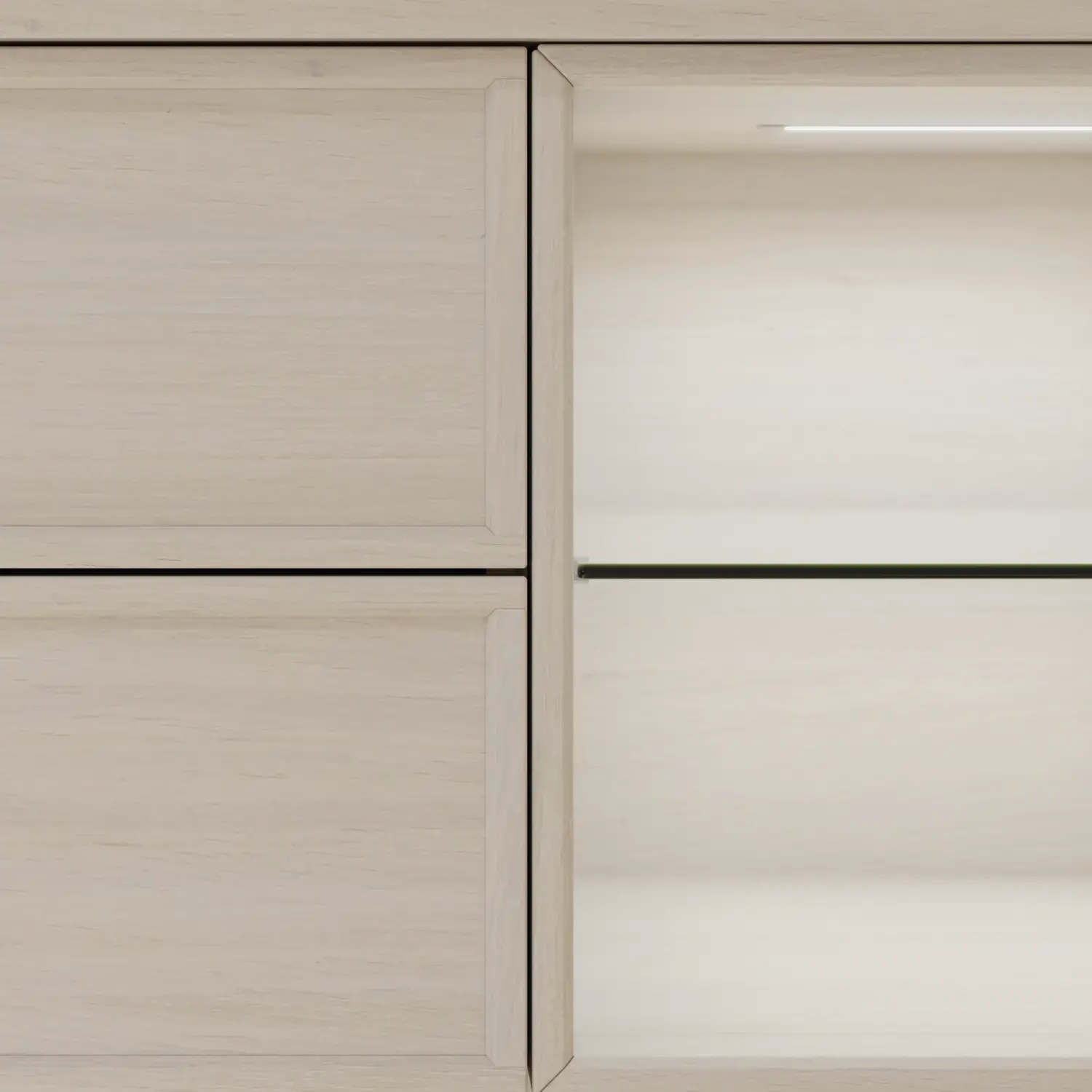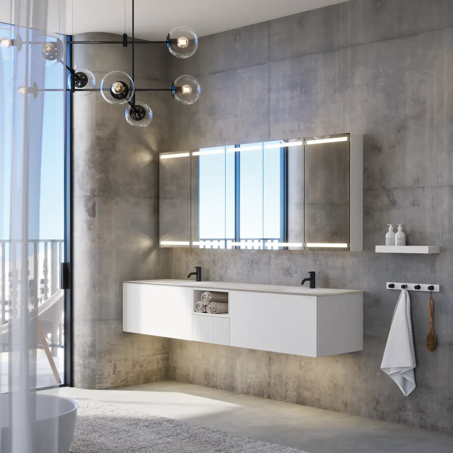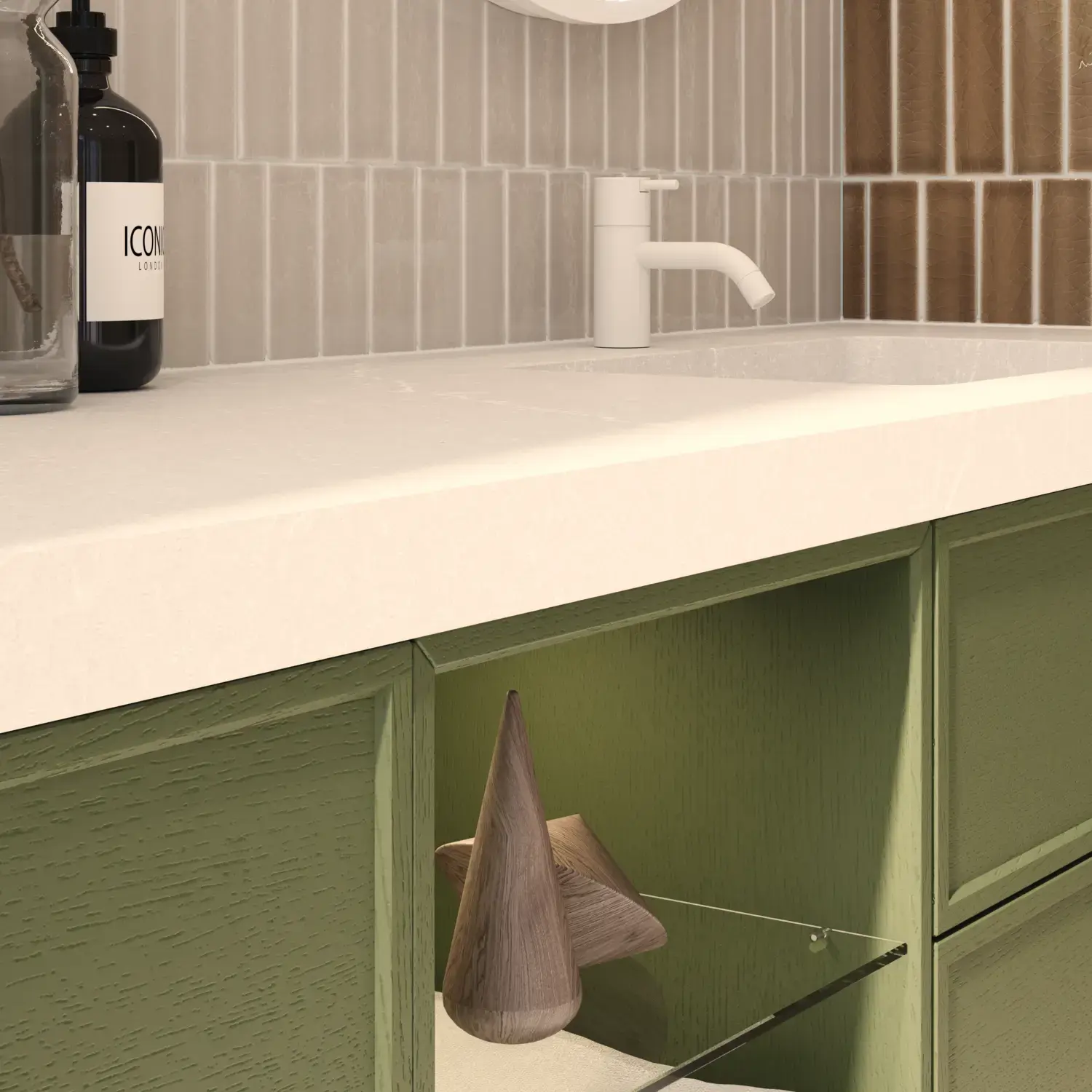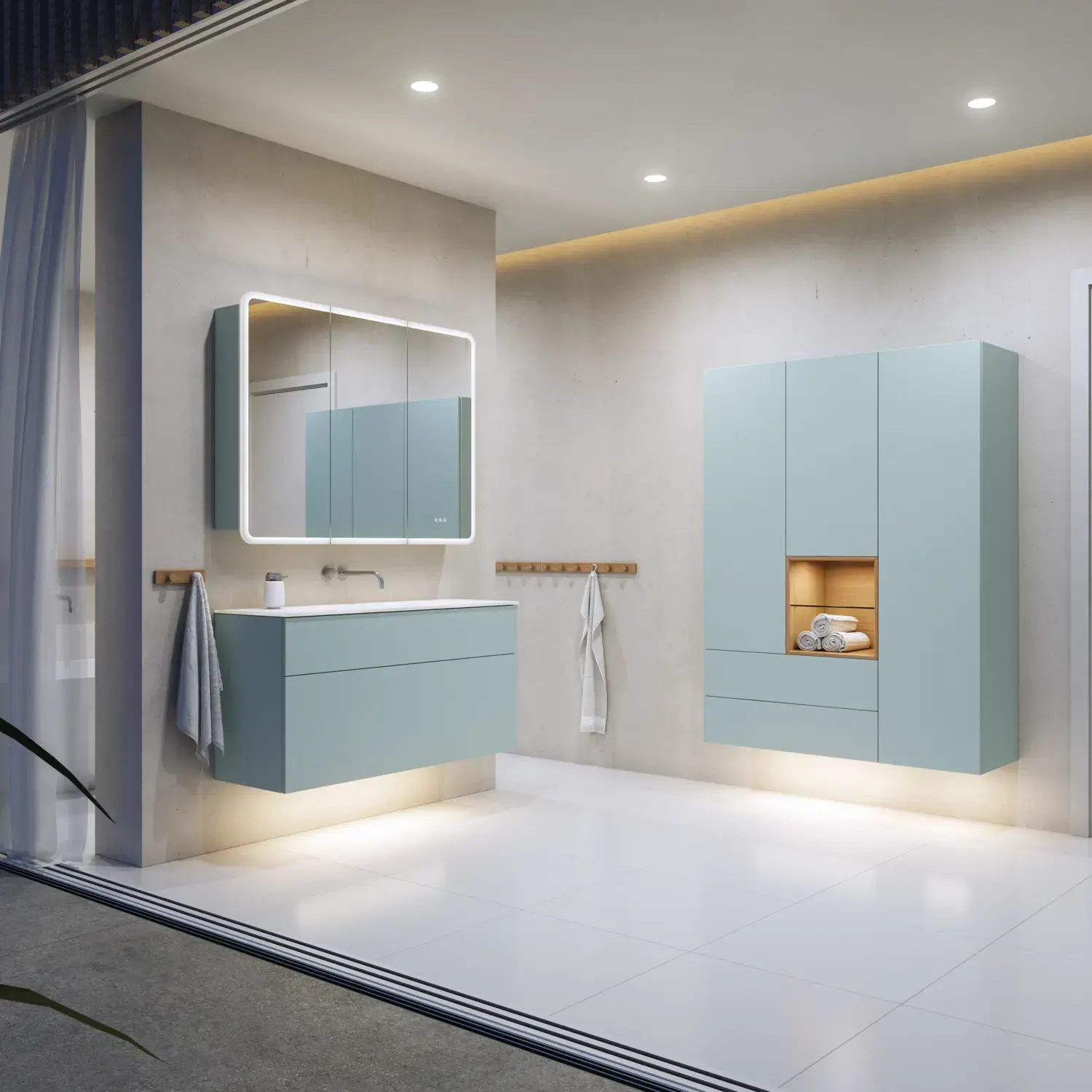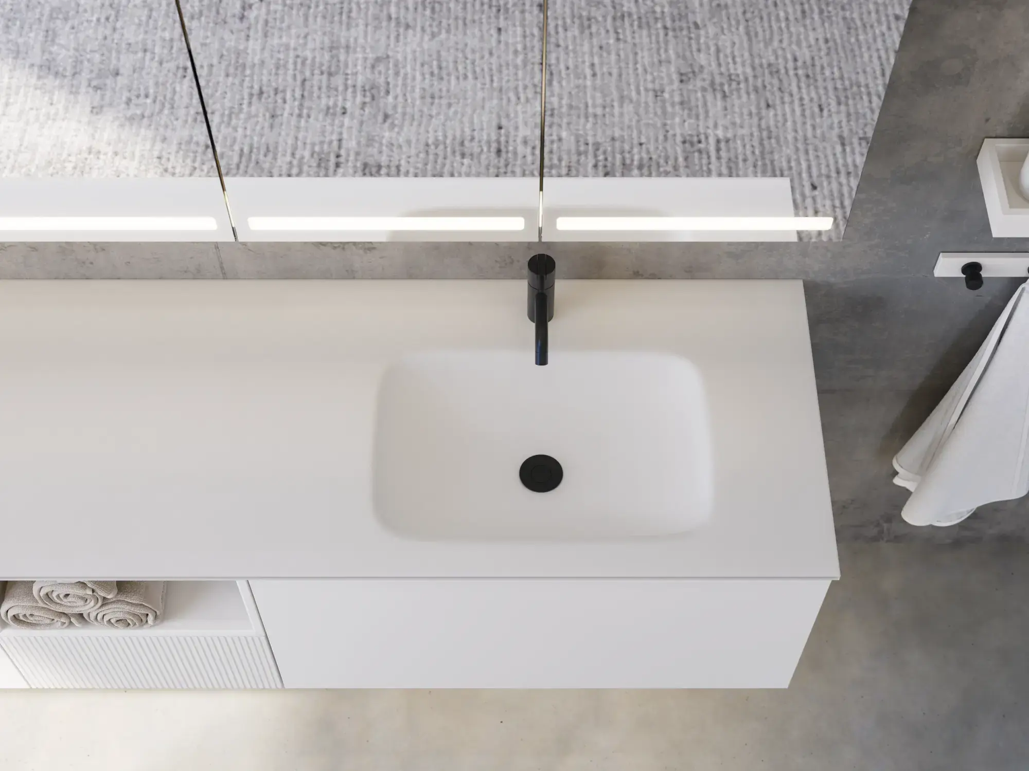När estetik och funktion smälter samman uppstår ett rum i perfekt balans. Med Calidris kan du inreda hela badrummet i ett sammanhängande uttryck – från de eleganta spegelskåpen och öppna hyllorna till de vägghängda högskåpen med belysning undertill.De rena linjerna, de taktila fronterna