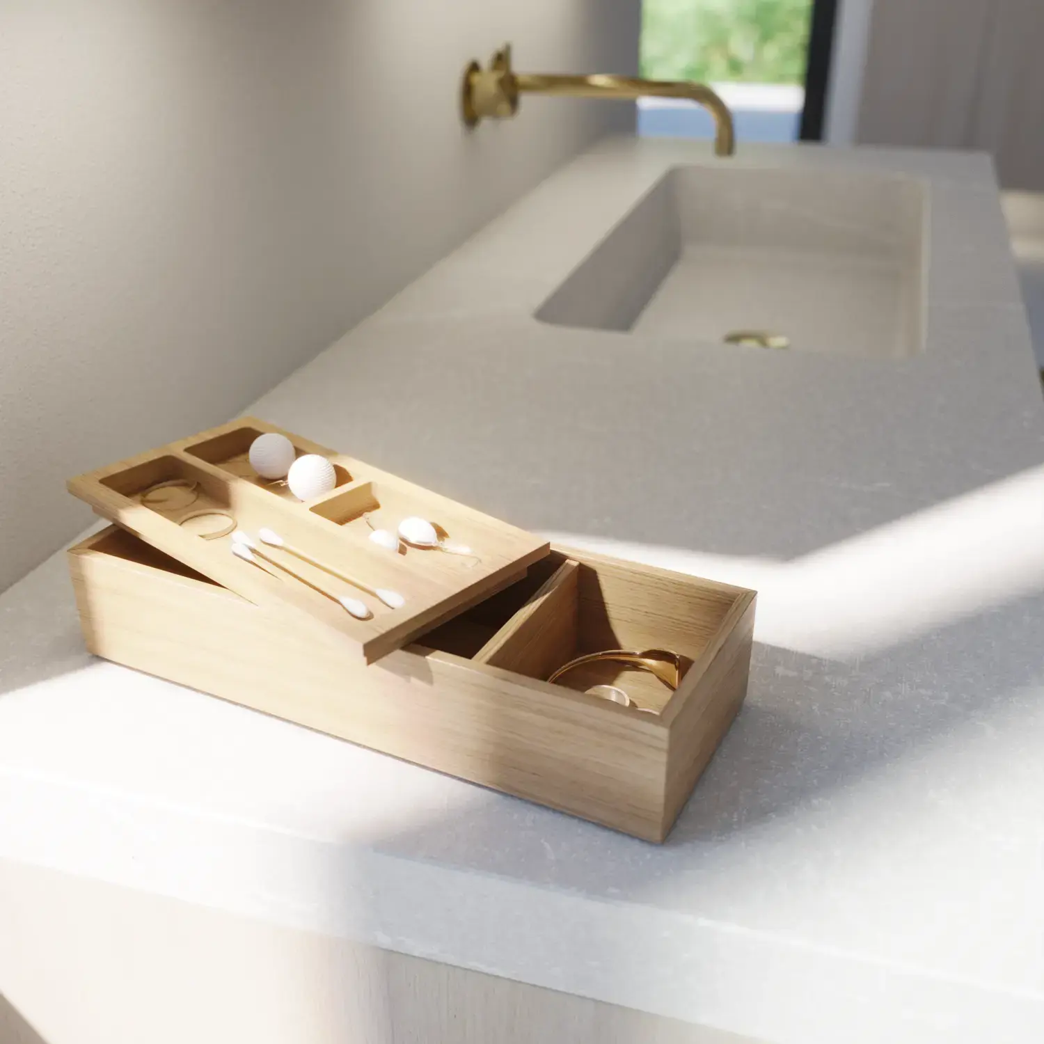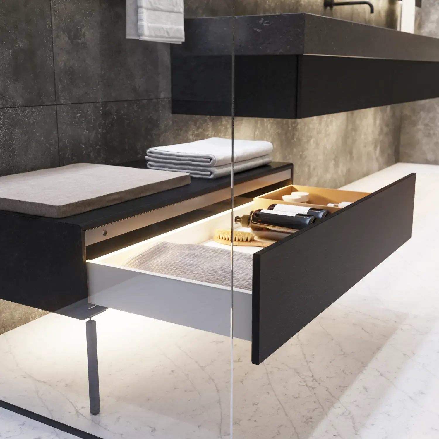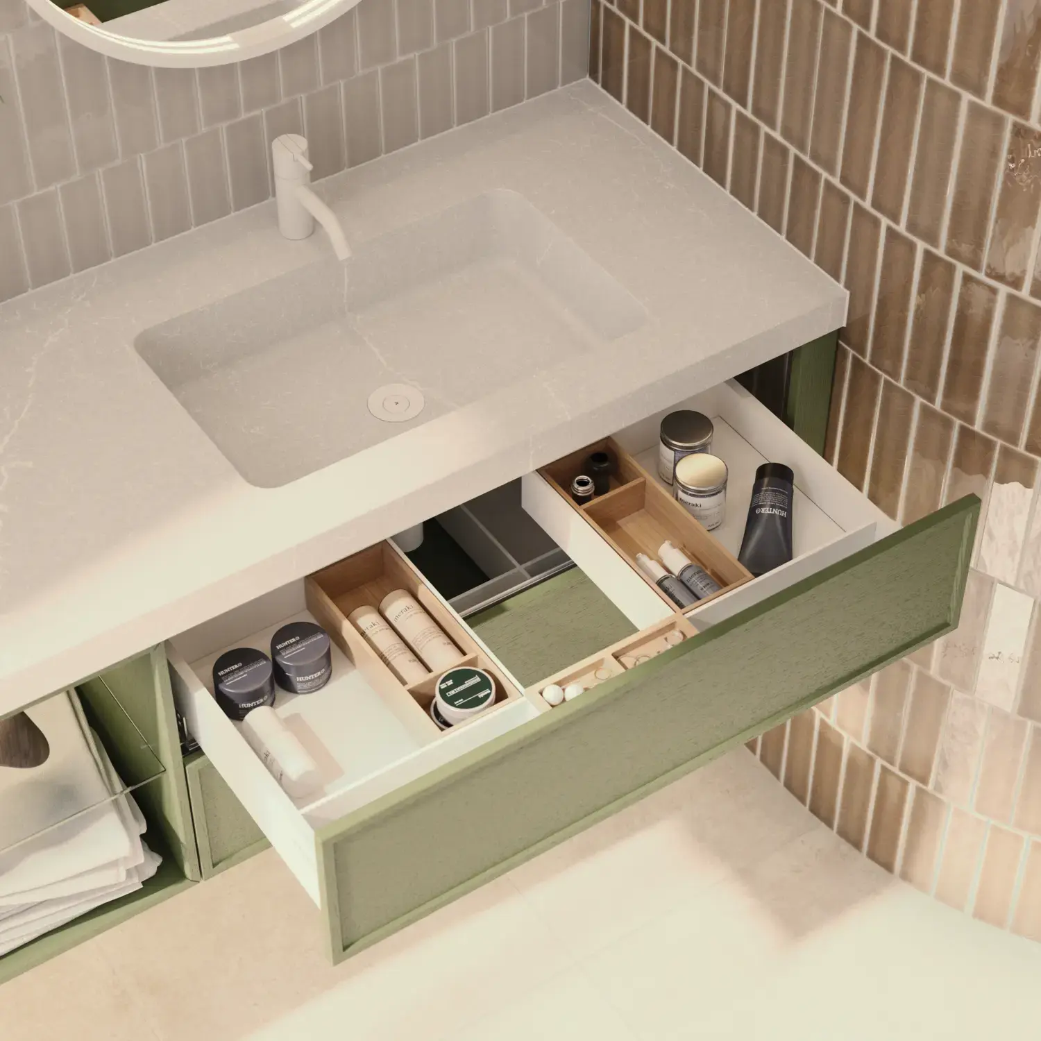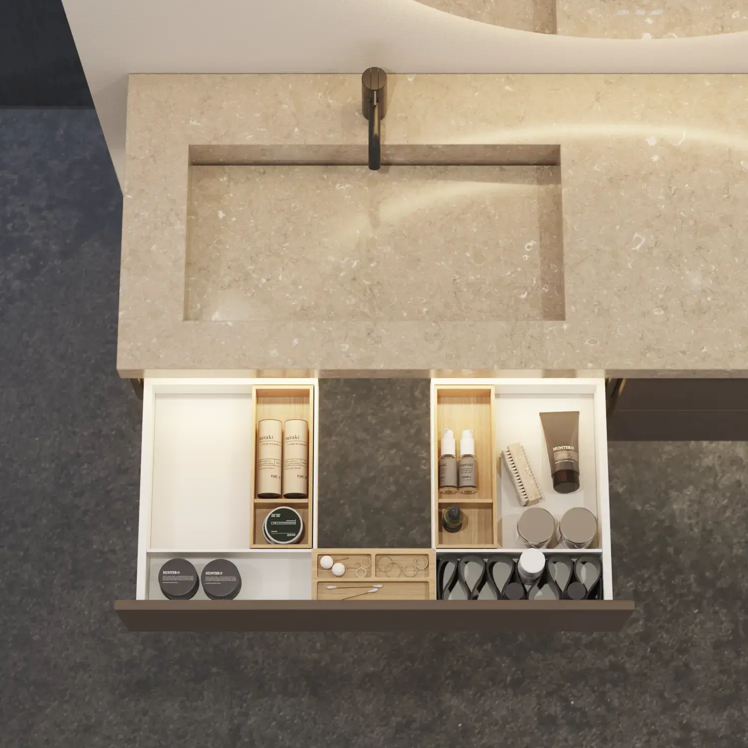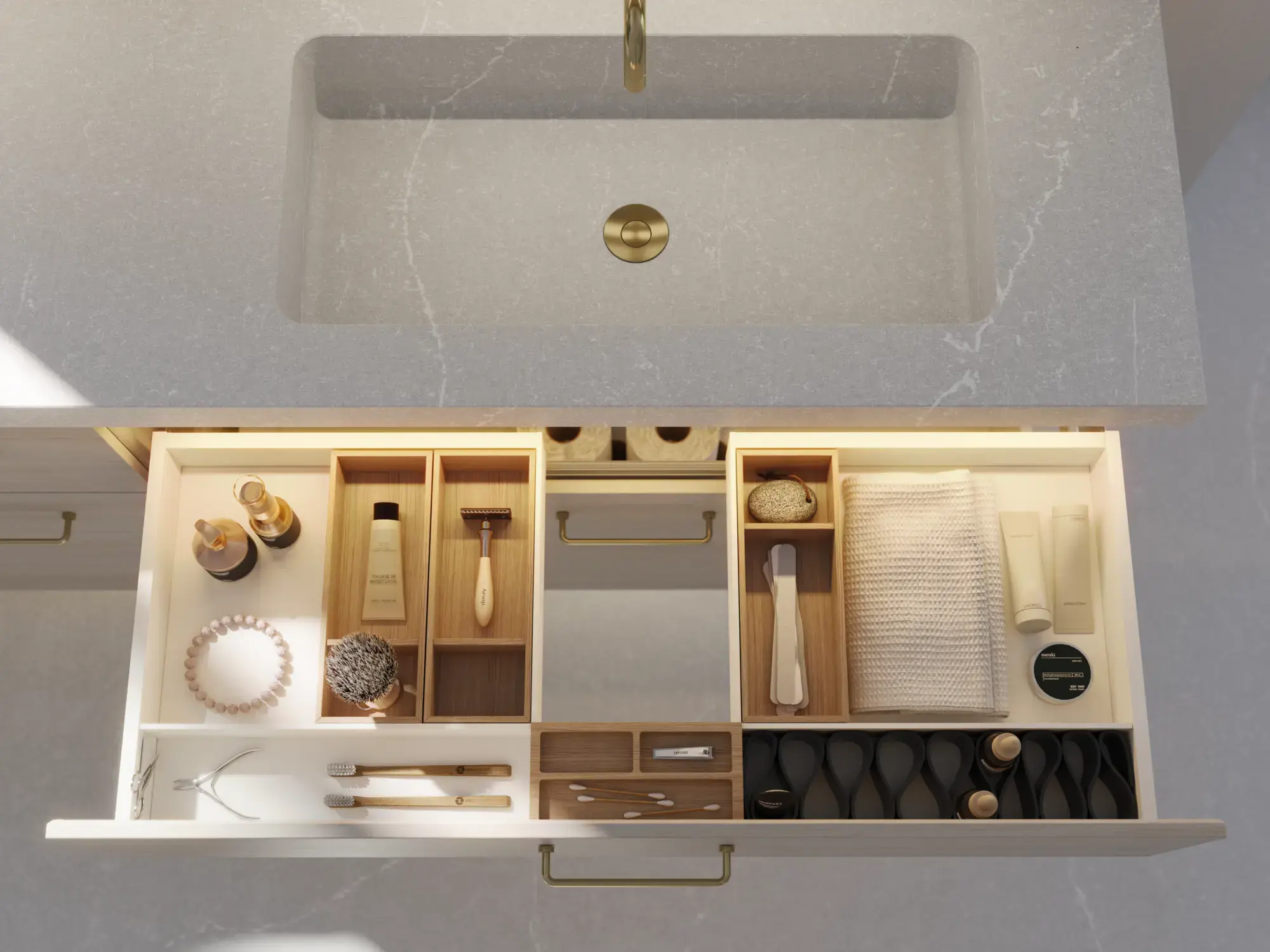 Håll ordning i dina skåp och lådor med eleganta tillbehör som förhöjer användarupplevelsen och underlättar rengöringen av ditt exklusiva badrum.