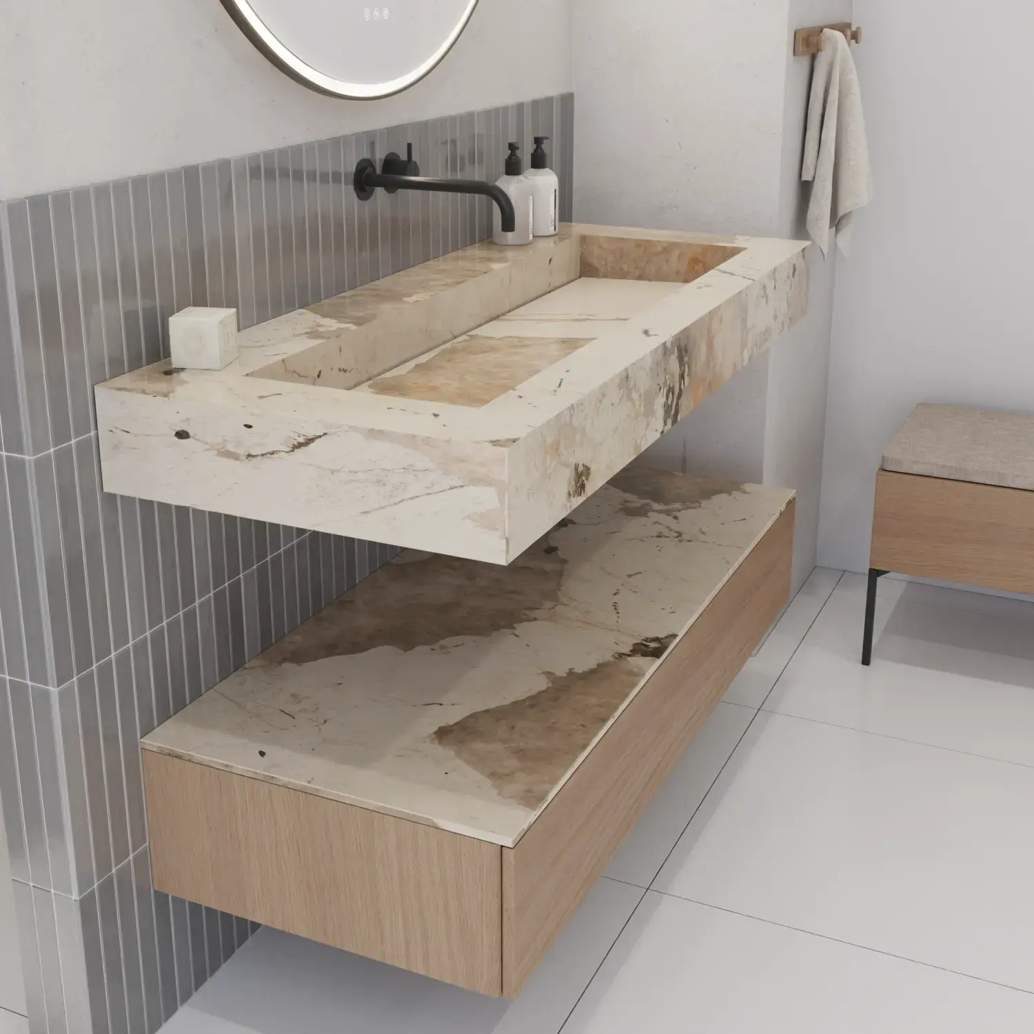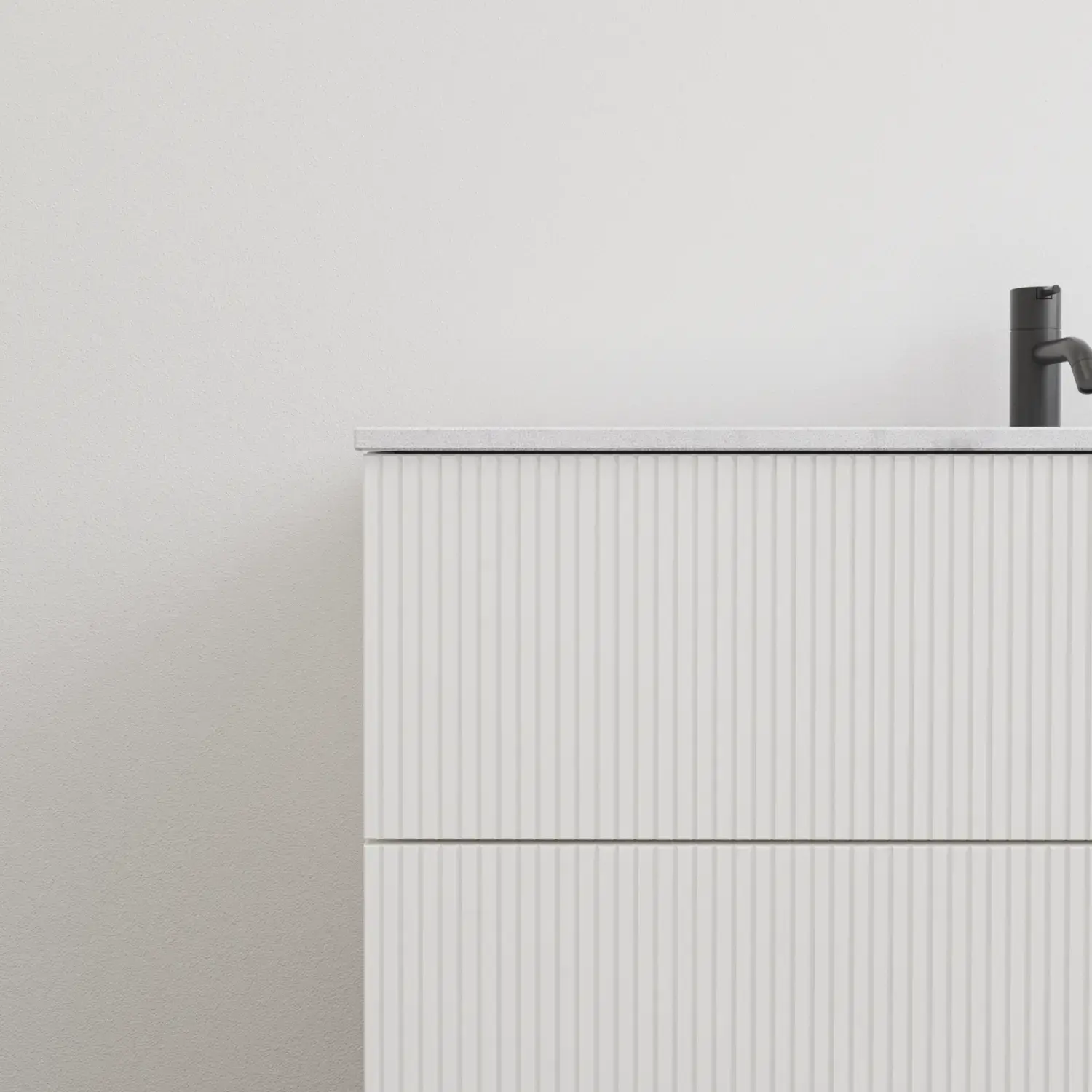Det vackra tvättstället sätter tonen för ett modernt badrum, där estetik och funktion går hand i hand. Den vägghängda designen och de horisontella linjerna ger en lätt och arkitektonisk balans – ett trendigt uttryck som känns både exklusivt och naturligt på samma gång.