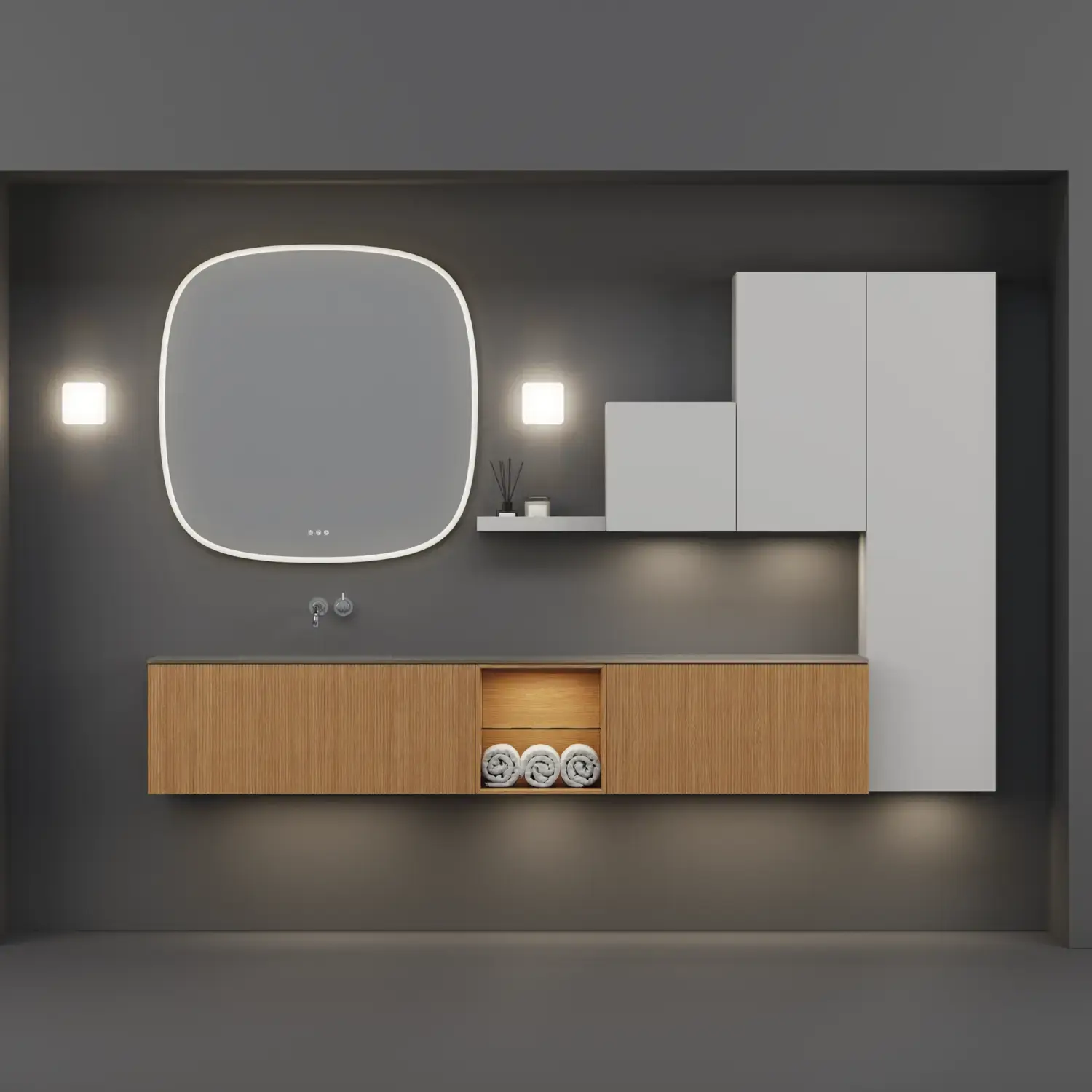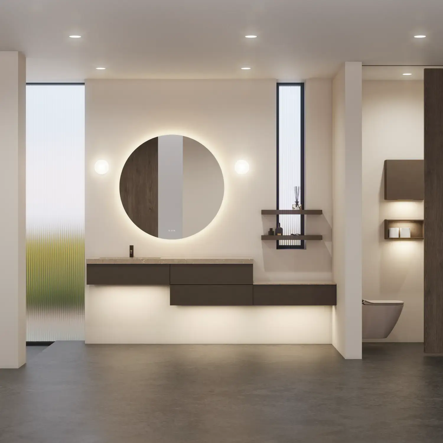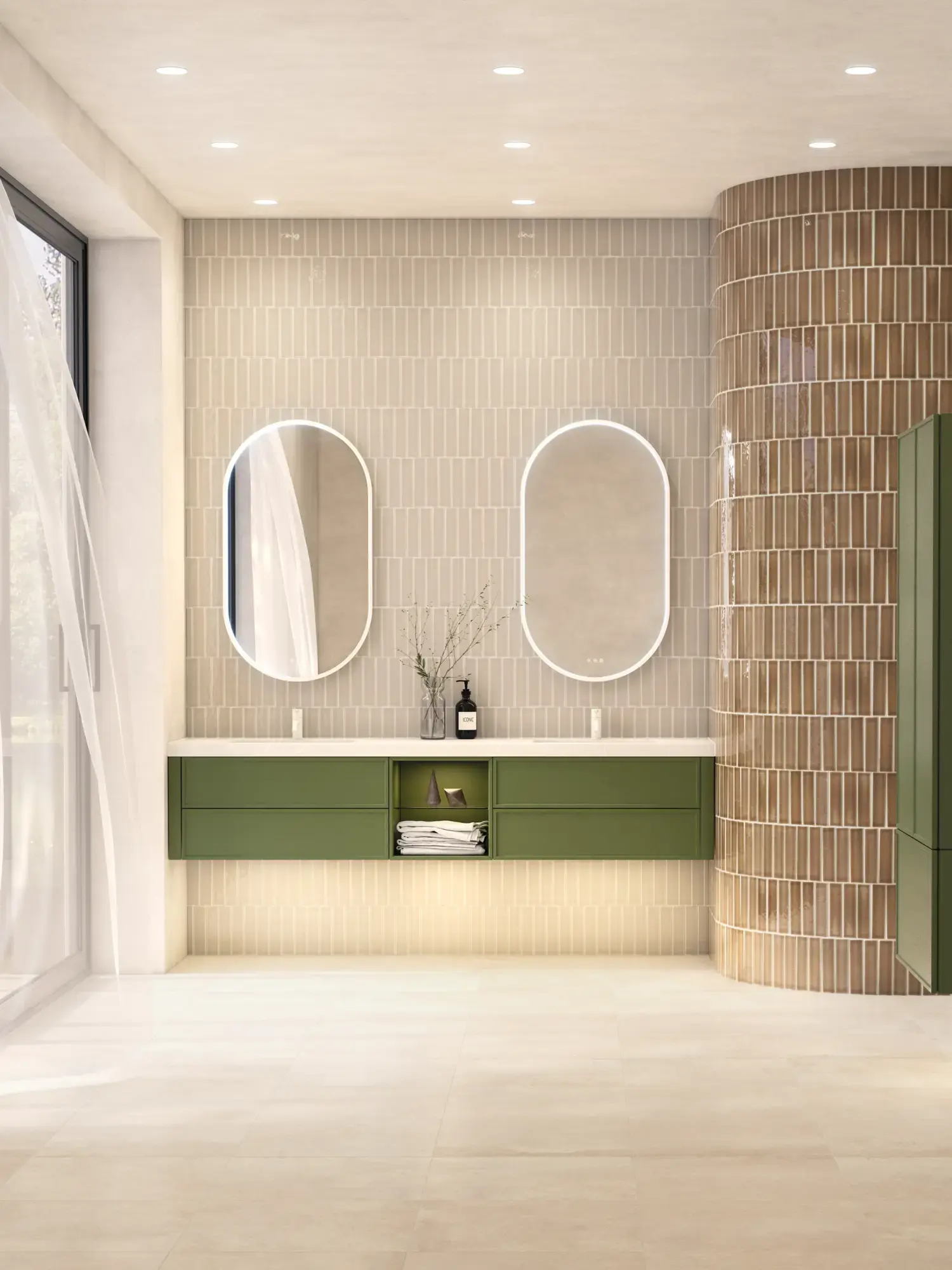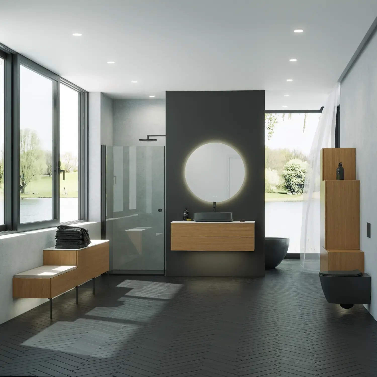 De rundade formerna i Moon-spegeln och det nya, exklusiva Demi-handtaget i trä tillför badrummet en lugn balans och en subtil känsla av värme.