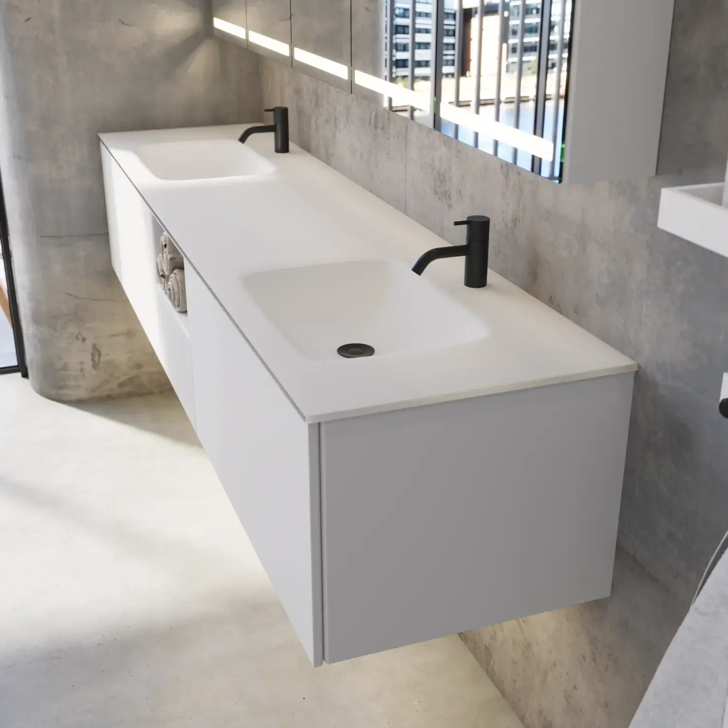 De eleganta linjerna fortsätter i de exklusiva tvättställen och bänkskivorna som enkelt kan anpassas så att de passar perfekt i ditt badrum. Serien har också ett stort urval av extra skåp, matchande speglar och olika typer av belysning som gör det både enkelt och roligt att inreda ett exklusivt badrum oavsett storlek och form.